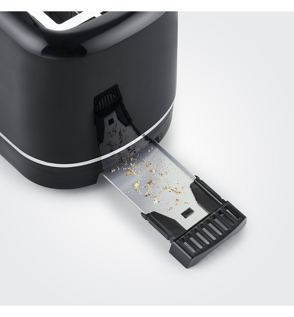 Centrage des tranches de pain pour un brunissage uniforme des deux côtés. Fonctions de décongélation, de réchauffage et d'éjection séparées avec voyant lumineux. Arrêt automatique en cas de blocage d'une tranche Degré de brunissage réglable. Tiroir ramasse-miettes pour un nettoyage facile.