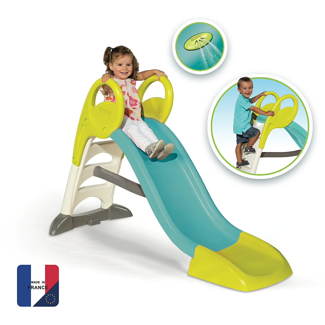 Le toboggan GM sera parfait pour les premières glisses de vos enfants ! Avec sa hauteur de 1m, ses marches antidérapantes et ses poignées ergonomiques, il est particulièrement adapté aux enfants de 2 ans et plus. En cas de grosse chaleur il vous suffira de raccorder un tuyau d'arrosage sous la glisse pour créer une cascade d'eau et rafraîchir vos petits ! Vous n'aurez aucun mal à le ranger car il est facilement démontable. Avec sa glisse de 1.50m et son traitement anti-UV, le toboggan GM promet des heures d'amusement !
