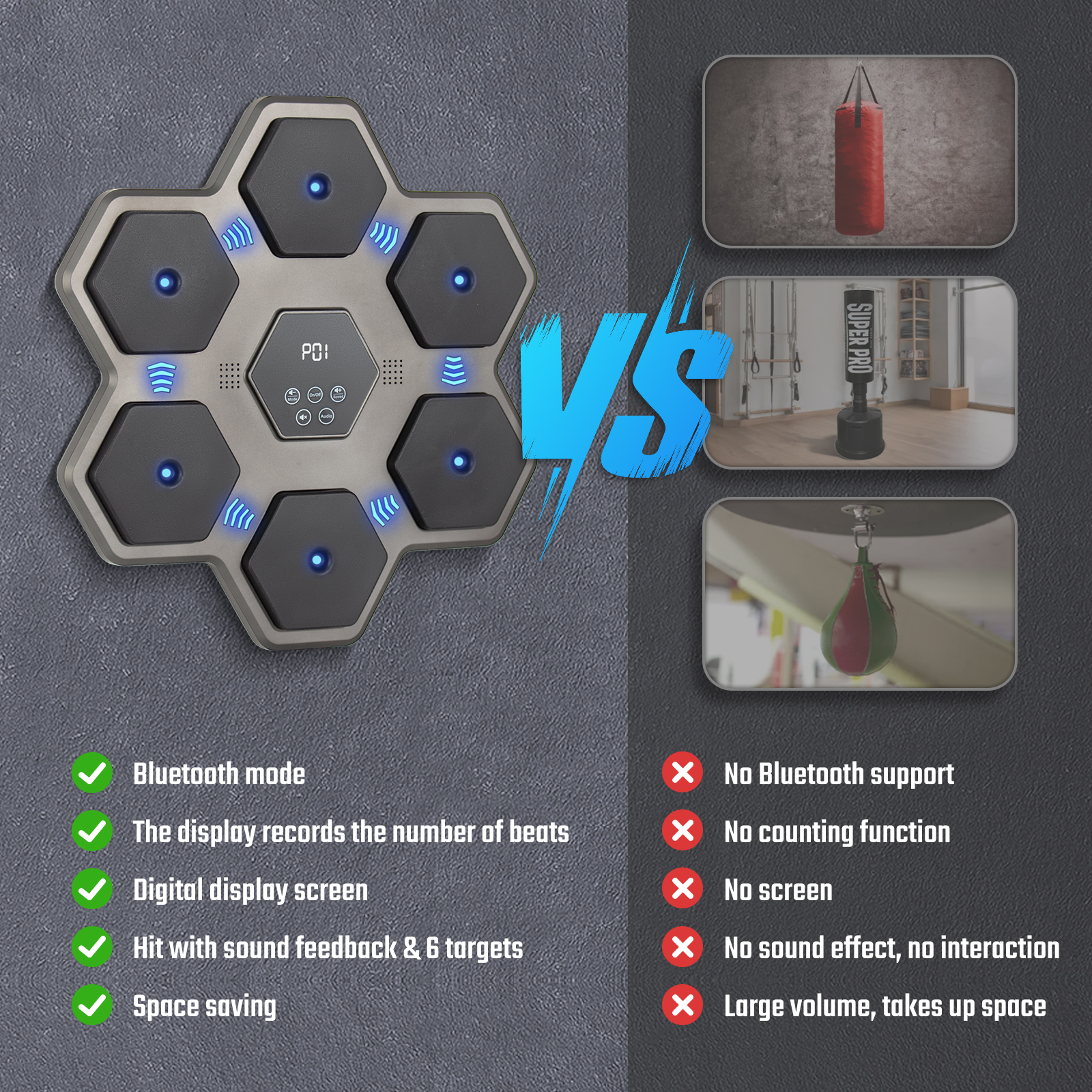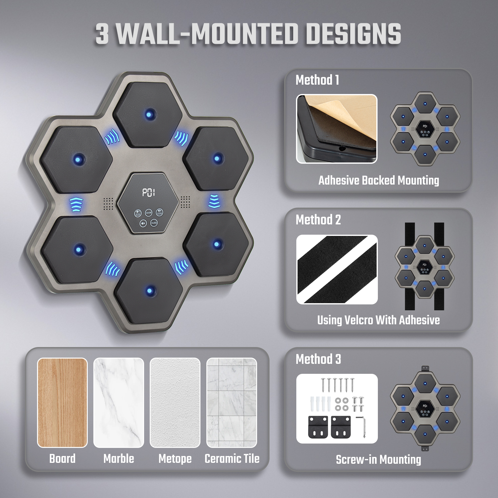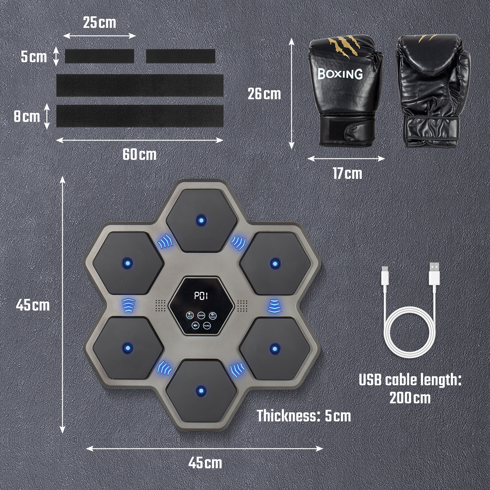【Machine de Boxe Musicale Améliorée】La puce intelligente améliorée augmente la sensibilité du coussin de frappe, offrant une gamme de volume plus large et un son plus clair. Elle améliore la vitesse de réaction et la coordination corporelle. Lorsque la cible s'allume et que vous la frappez, elle compte automatiquement. Idéale pour l'entraînement professionnel et l'exercice quotidien, adaptée aux boxeurs, amateurs de fitness, adultes et enfants. 【9 Modes & 9 Vitesses】Notre machine de boxe musicale est équipée de 9 modes de frappe réglables et de 9 vitesses de frappe, offrant une expérience d'entraînement variée et excitante, et améliorant pleinement votre vitesse de réaction et votre coordination corporelle. De plus, notre machine de boxe musicale comptera le nombre de fois que vous frappez correctement la machine, jusqu'à un maximum de 999 fois. 【Machine de Boxe Musicale Bluetooth】La machine de boxe intelligente prend en charge la connectivité Bluetooth, et la fonction Bluetooth reste en veille pendant de longues périodes. En utilisant le Bluetooth, vous pouvez facilement connecter aux haut-parleurs de la machine et jouer votre musique préférée pendant votre entraînement. Avec des haut-parleurs intégrés de haute qualité et la technologie sans fil Bluetooth, vous pouvez vous immerger dans un entraînement exaltant. 【Robuste et Durable】La machine de boxe musicale est fabriquée en mousse haute performance, assurant un effet de rebond et d'absorption des chocs qui protège entièrement les mains des utilisateurs. Les autres composants sont construits avec un matériau PU robuste et durable. Par ailleurs, la configuration à trois couches d'absorption des chocs résiste aux entraînements intenses, offrant une protection complète. 【Installation Facile】La machine de boxe musicale est montée au mur, utilisant du ruban adhésif double face et du Velcro pour se fixer sur divers types de murs, économisant de l'espace. Il n'est pas nécessaire de percer des trous dans le mur. Vous pouvez ajuster la hauteur selon vos préférences personnelles, vous permettant de vous entraîner à la maison à tout moment sans avoir besoin d'aller à la salle de sport.