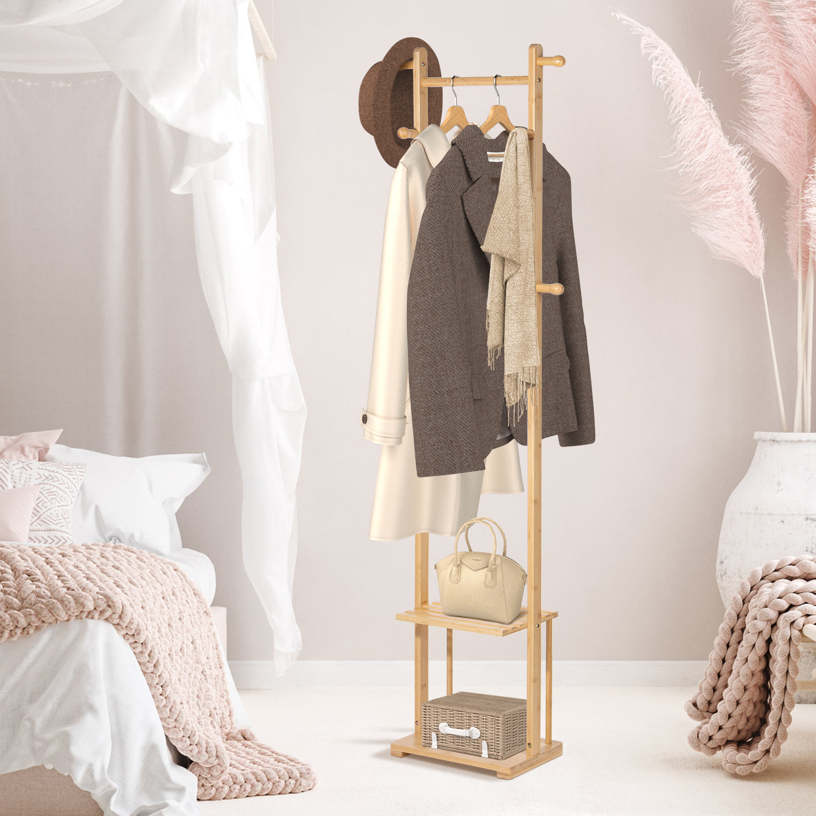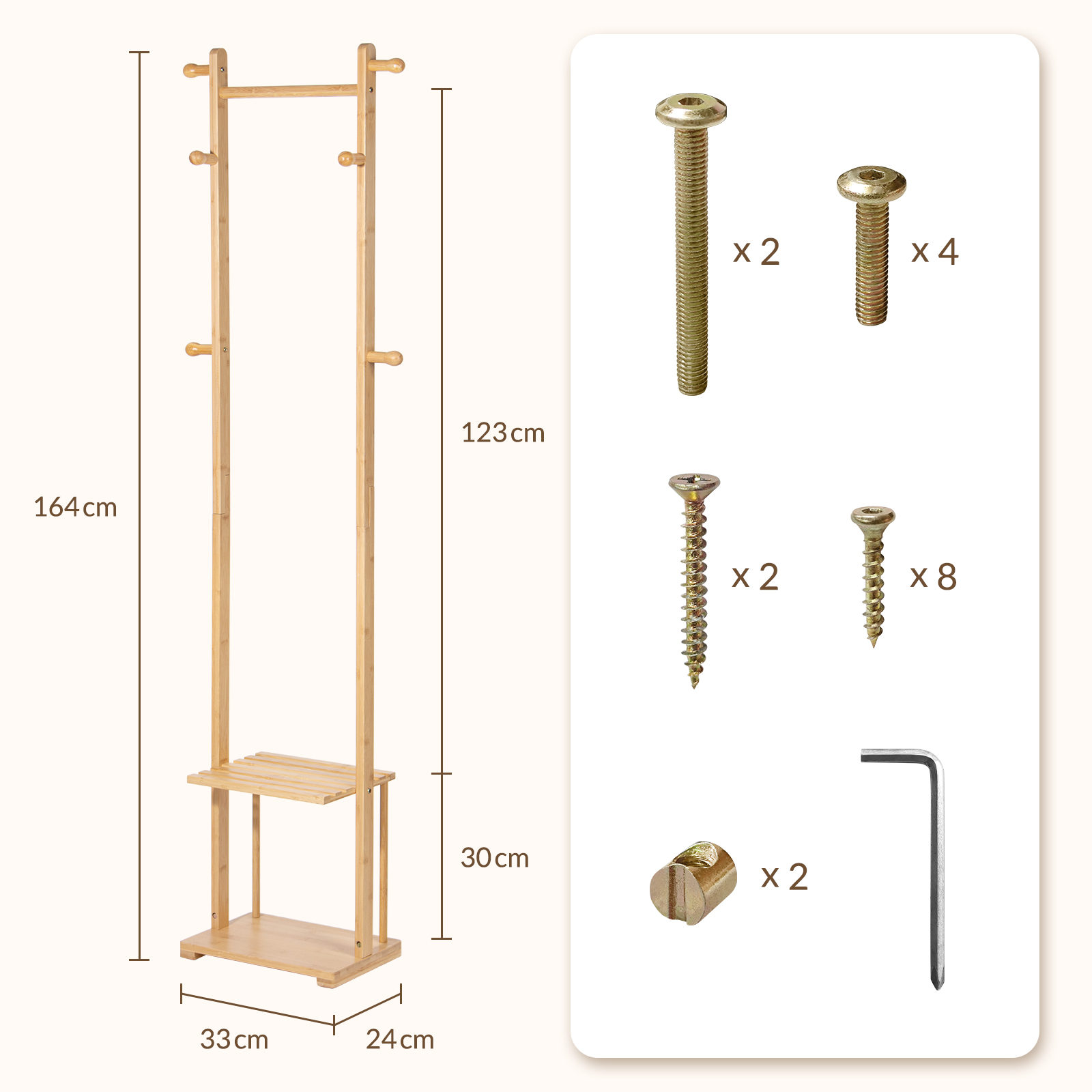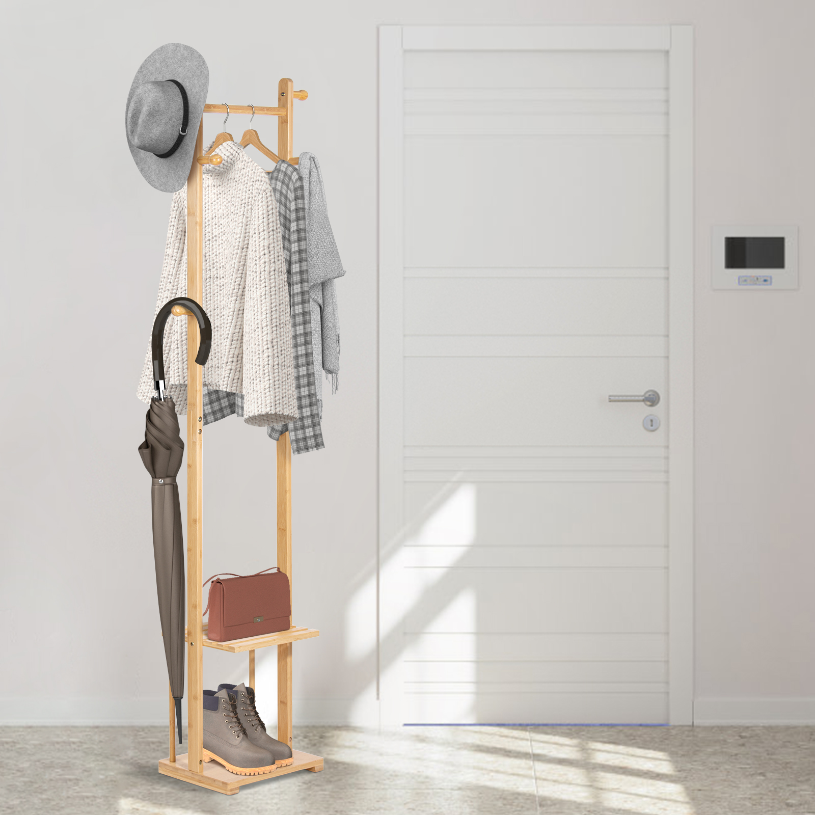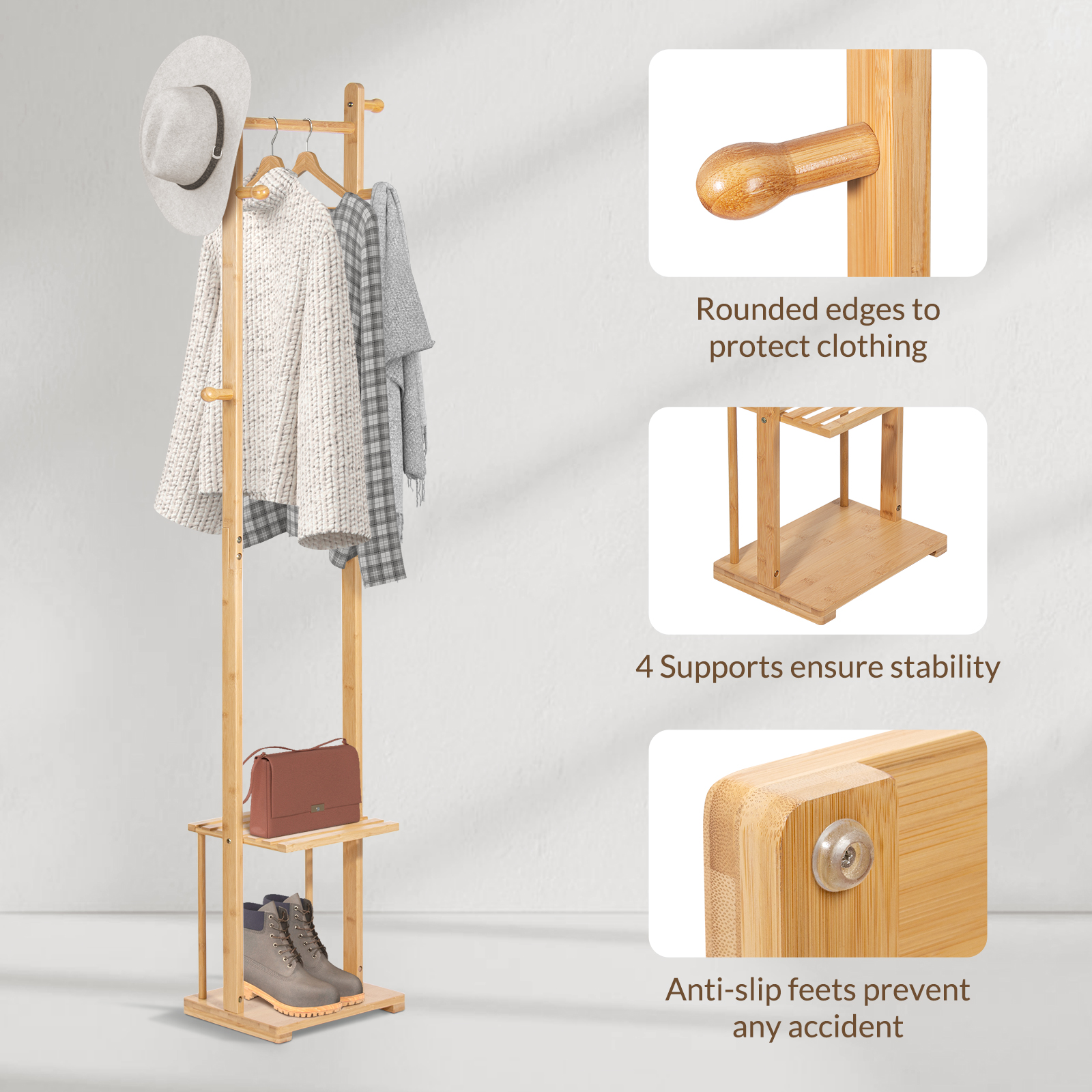 Todeco Porte Manteau Sur Pieds Bambou avec étagère à 2 niveaux, 6 Patères et Tringles, Tapis Antidérapant
