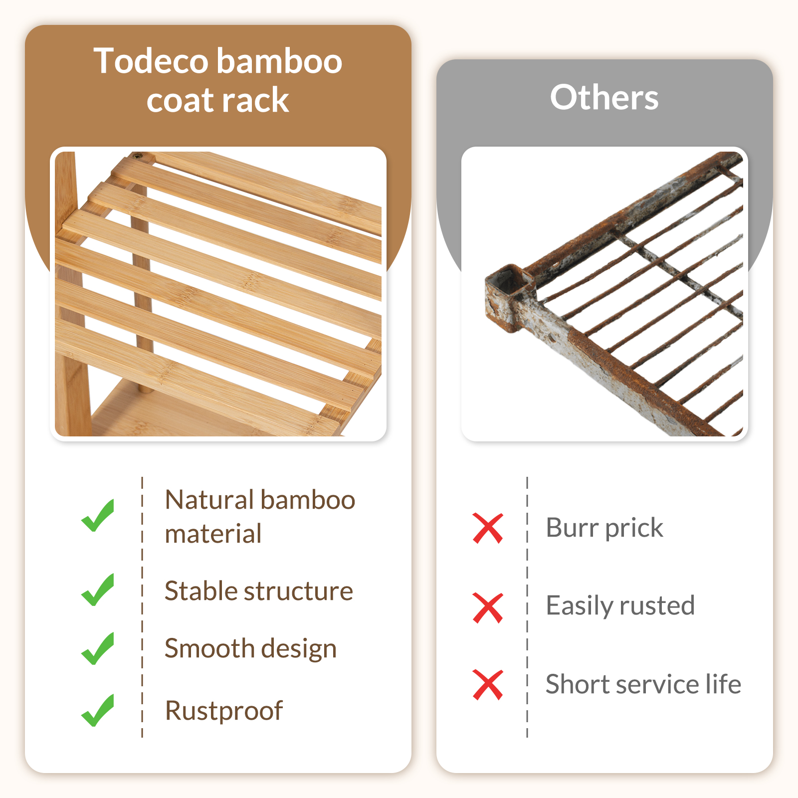 | Libellé | Todeco Porte Manteau Sur Pieds Bambou avec étagère à 2 niveaux, 6 Patères et Tringles, Tapis Antidérapant |