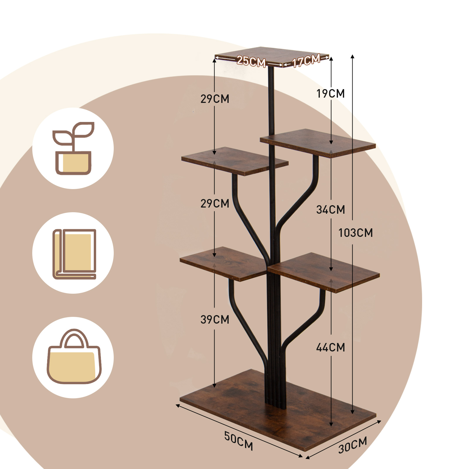 Passer le carrousel d'imagesDesign Polyvalent et Décoratif: Inspiré par la beauté de la nature, ce support plantes intérieur en forme d’arbre peut accueillir jusqu’à 7 plantes en pot. Son style minimaliste, associant panneaux à effet bois et structure métallique noire, apporte une touche rétro chic qui s’intègre parfaitement à tout type de décoration, aussi bien à l’intérieur qu’à l’extérieur. Véritable porte plante intérieur, il sublime votre espace de vie tout en restant fonctionnel.