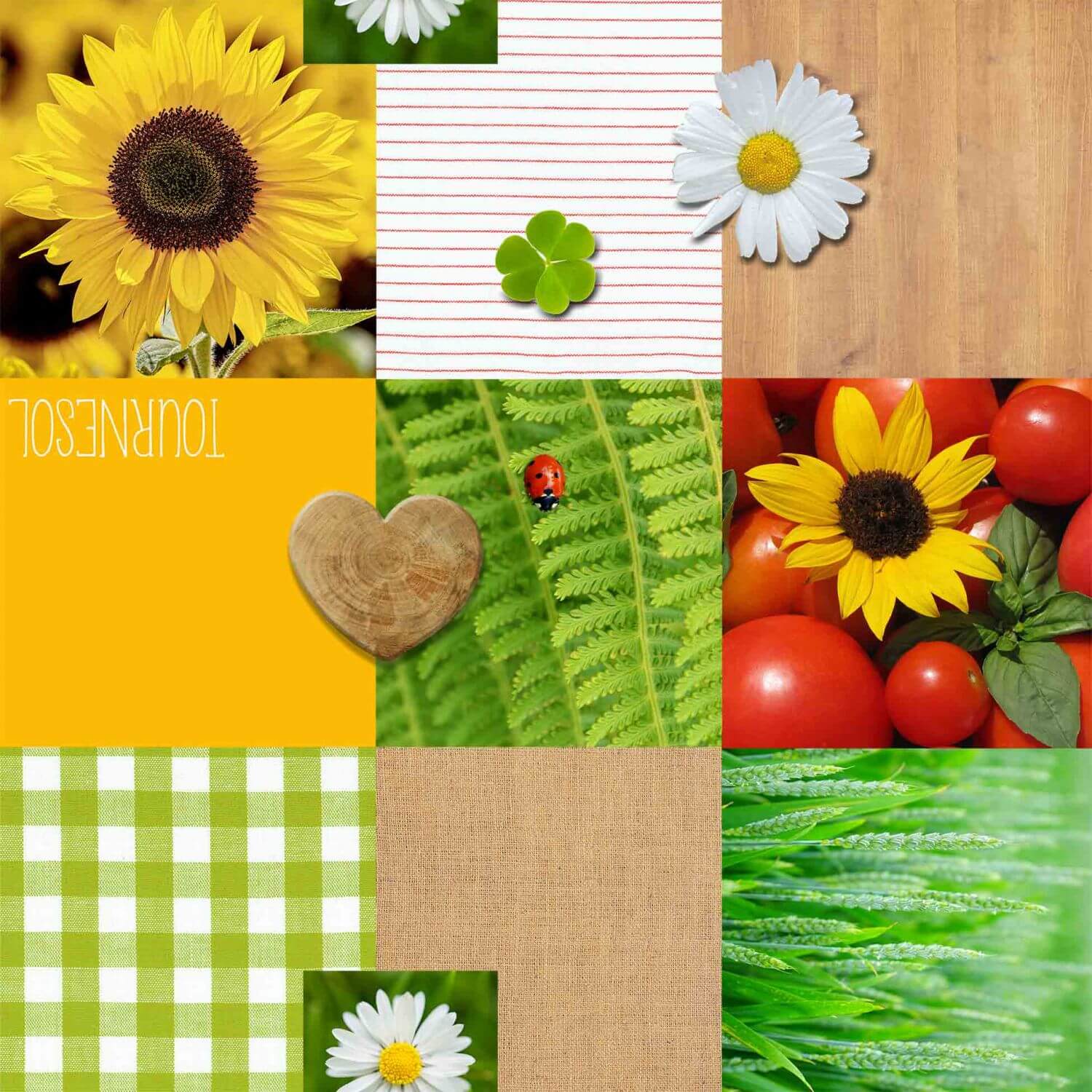 Toile cirée vendue au mètre ambiance nature - motif tournesols, marguerites, trèfles et légumes