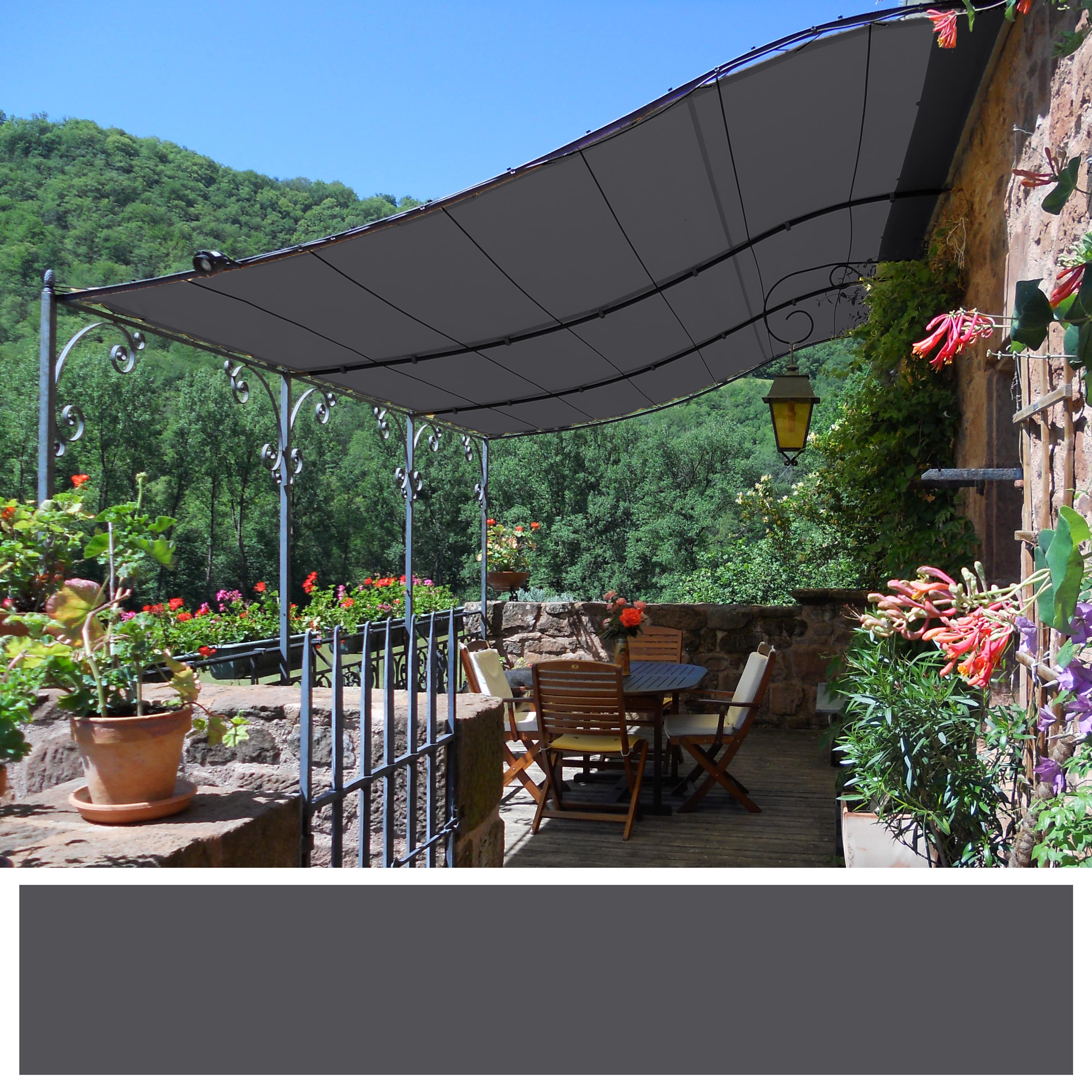 Toile d'ombrage imperméable de dimensions 4,00 x 3,50 m pour pergola ou tonnelle. Tissu enduit PVC 640 g/m² (type bâche) coloris Gris foncé de qualité supérieure qui vous protégera des intempéries, des rayons UV, de la chaleur et des éblouissements pendant très longtemps (10 à 15 ans en exposition permanente). La toile est doublée tout le tour et possède des œillets inox tous les 35 cm environ. Pour la fixation, nous vous fournissons du sandow 8 mm (câble élastique).