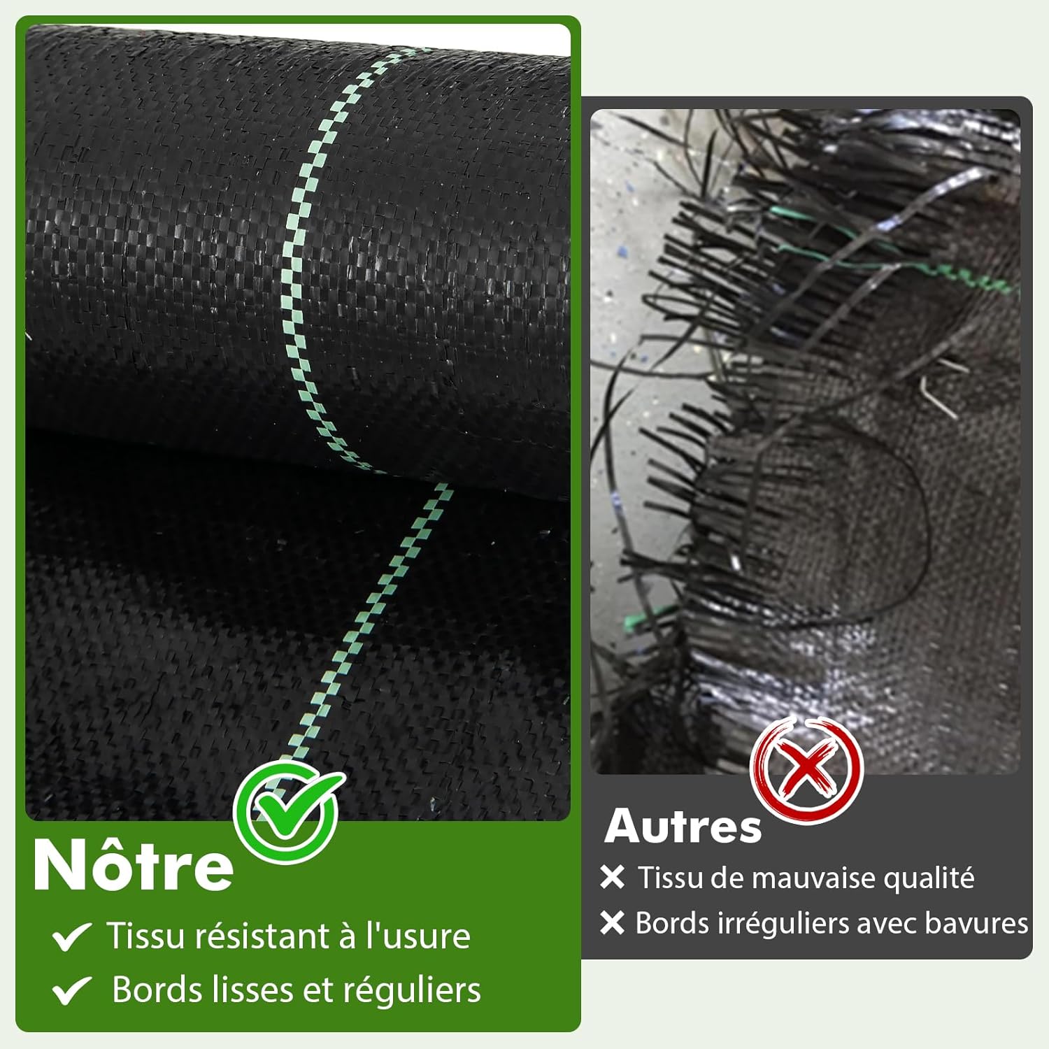 - Tissu PP de haute qualité: Le tissu barrière contre les mauvaises herbes présente une densité de tissu substantielle de 60 g/m² / 100 g/m², offrant l'équilibre parfait entre durabilité et fonctionnalité, conçu pour des années d'utilisation.