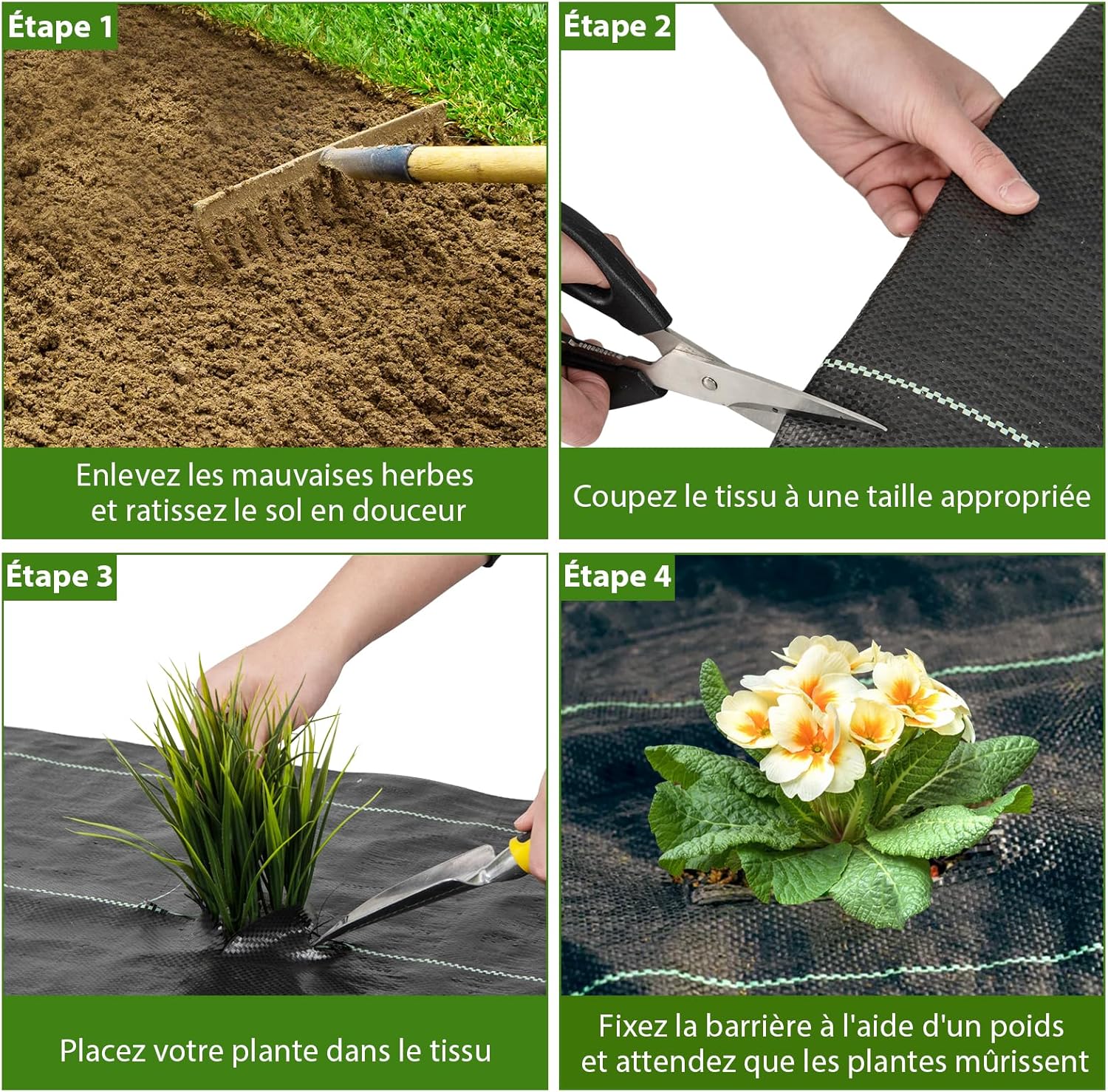 - Santé optimale des plantes : Optez pour un choix respectueux de l'environnement avec ce tissu barrière contre les mauvaises herbes qui élimine le besoin de produits chimiques nocifs. Sans danger pour vos plantes et votre sol, il maintient naturellement la santé et la beauté de votre espace extérieur.