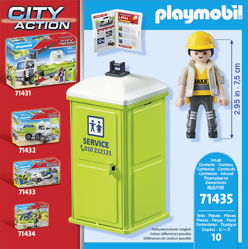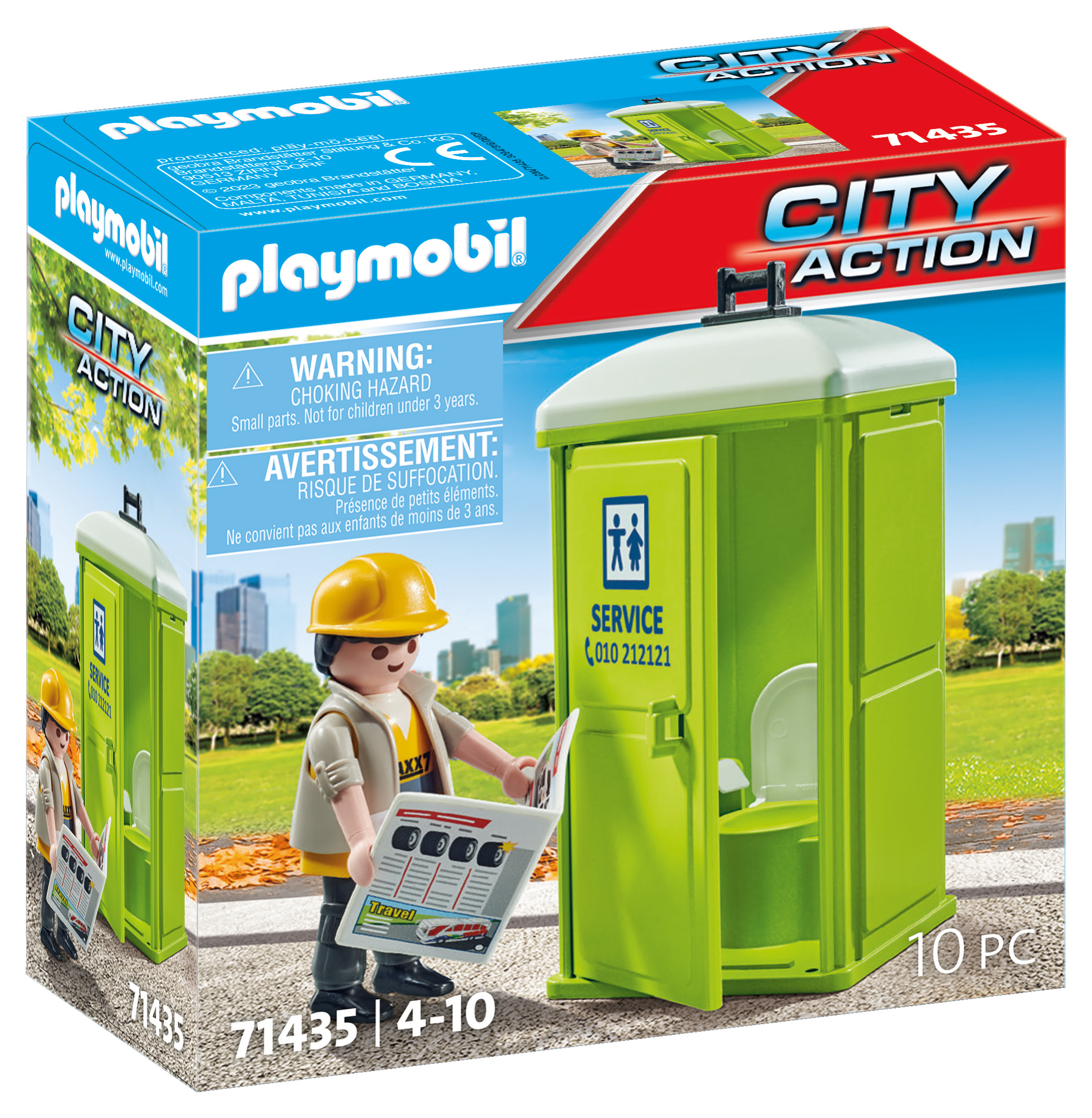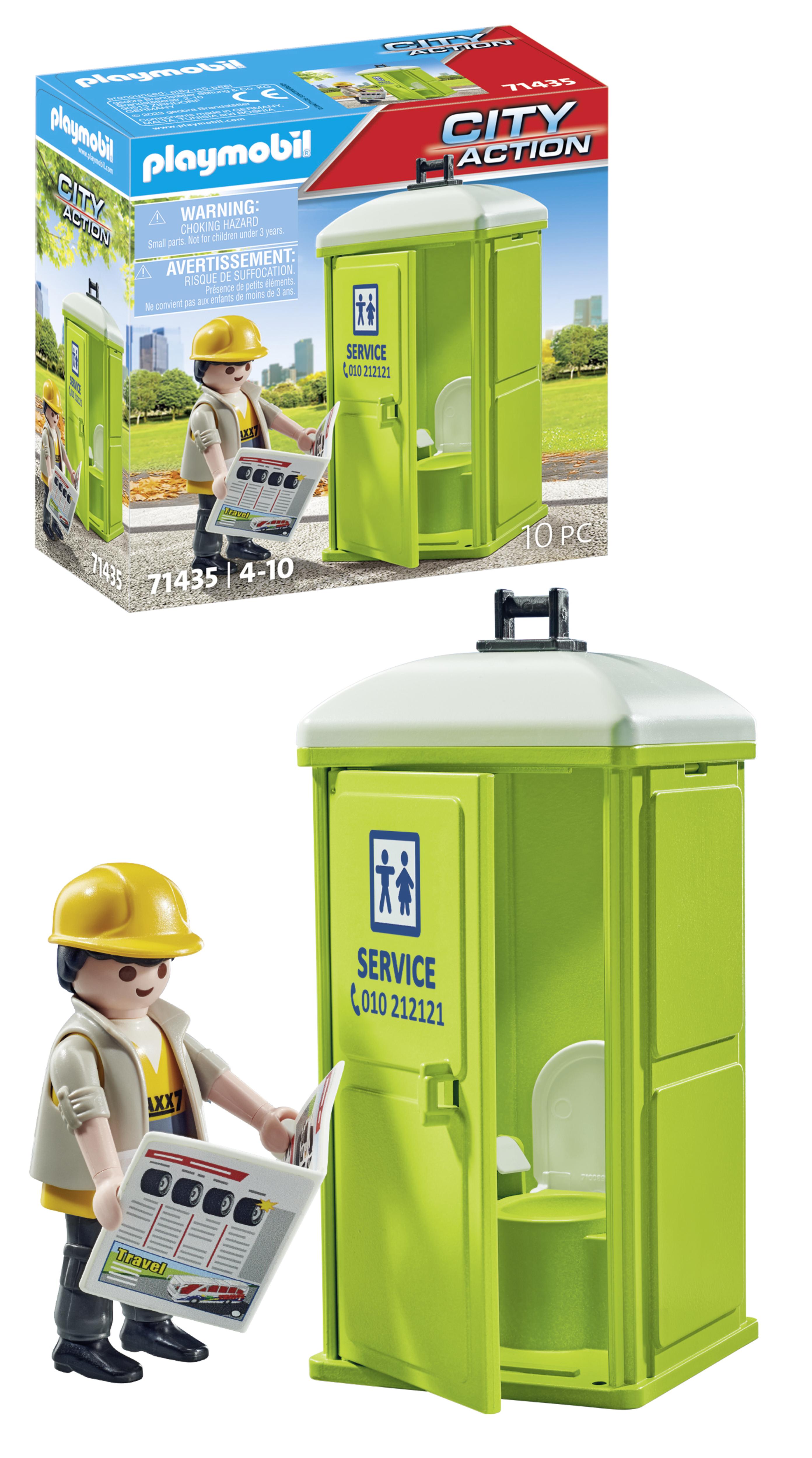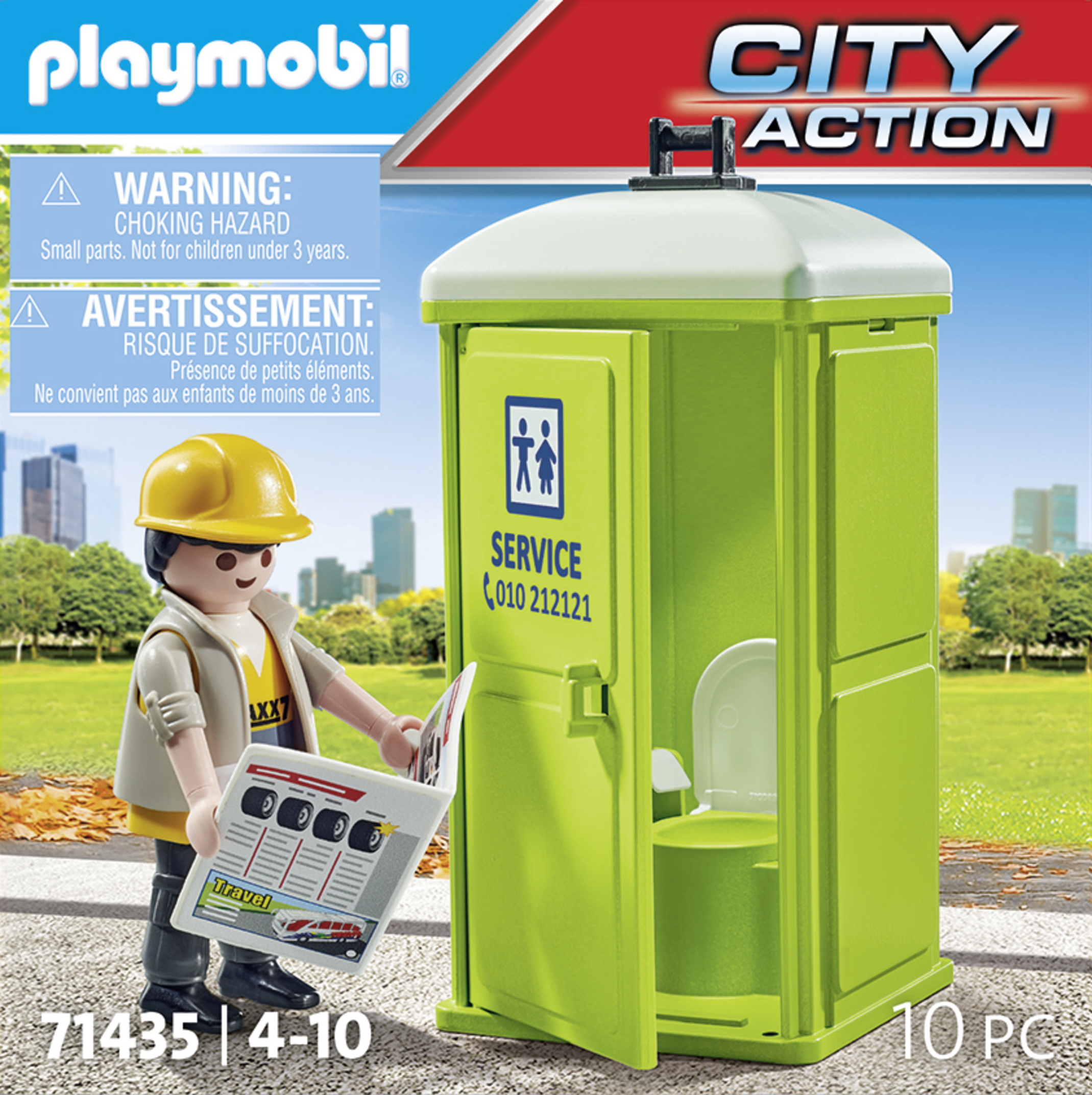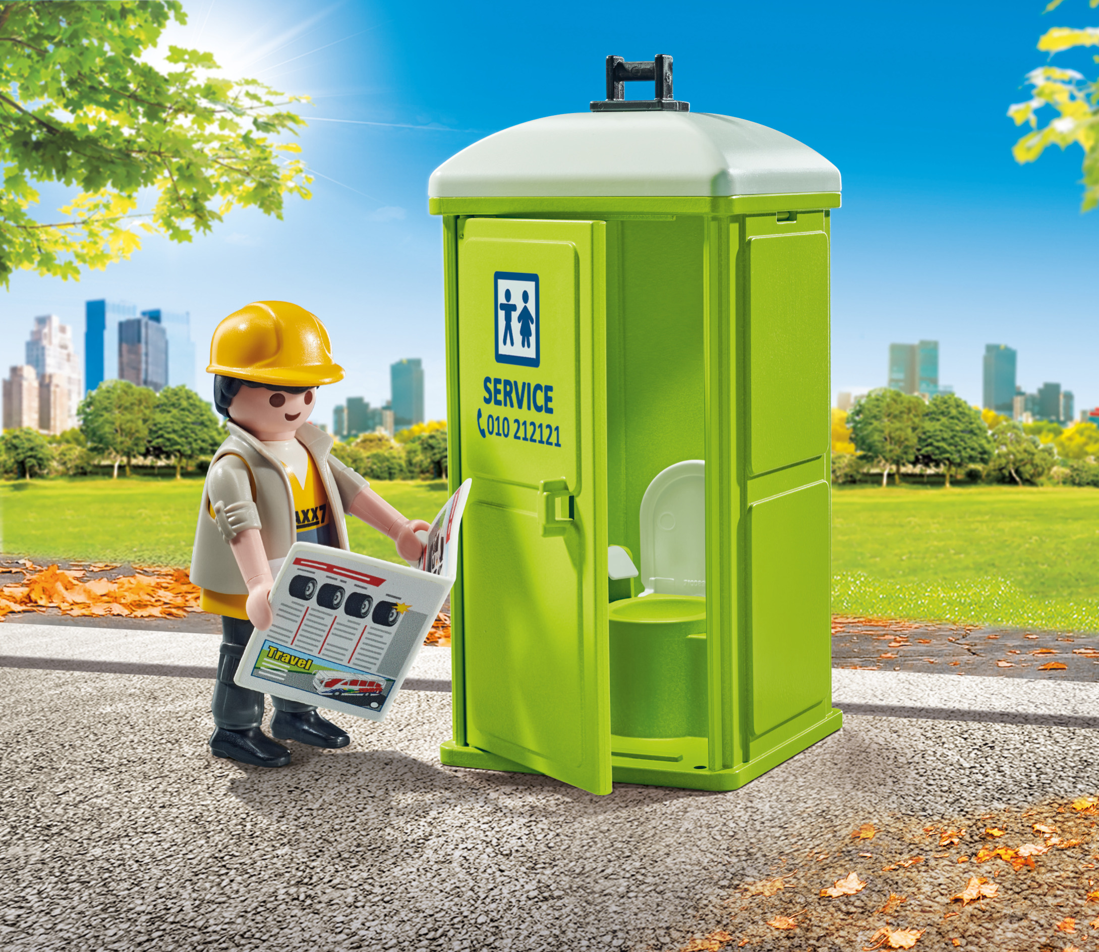 | Plus produit | Comprend un personnage avec un casque de chantier \nComprend des toilettes mobiles vertes \nLe crochet sur le toit des toilettes mobiles permet de les déplacer avec une grue PLAYMOBIL\nAvec un journal pour que le personnage puisse lire aux toilettes |
