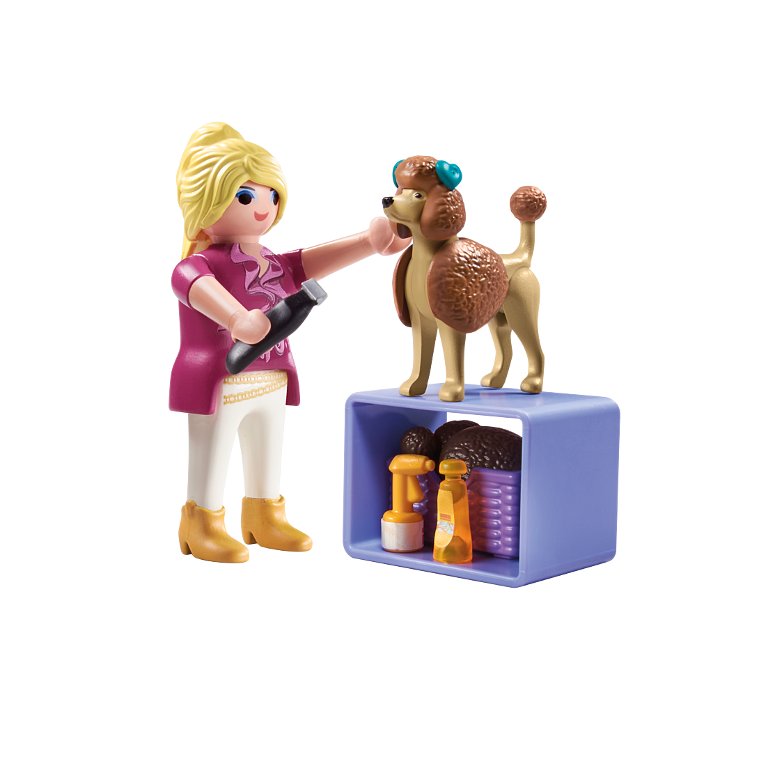 Personnages : 1 femme Animaux : 1 caniche Accessoires : 1 "table de travail", 1 caisse de rangement, 1 sèche-cheveux, 1 vaporisateur, 1 bouteille de shampooing, 1 rasoir, 1 brosse, 1 sac, 4 badges, 2 paires de gants, 1 paire de gants.