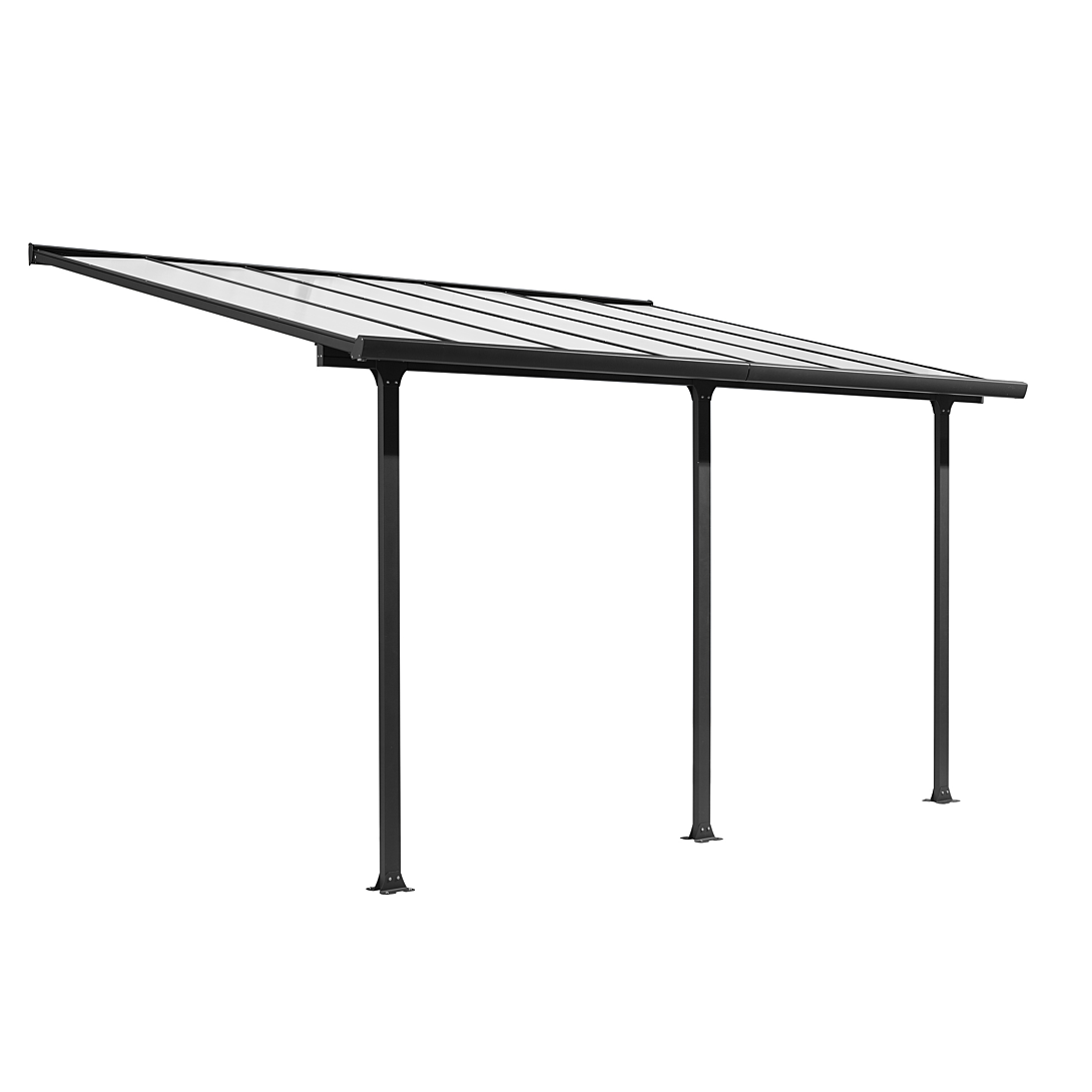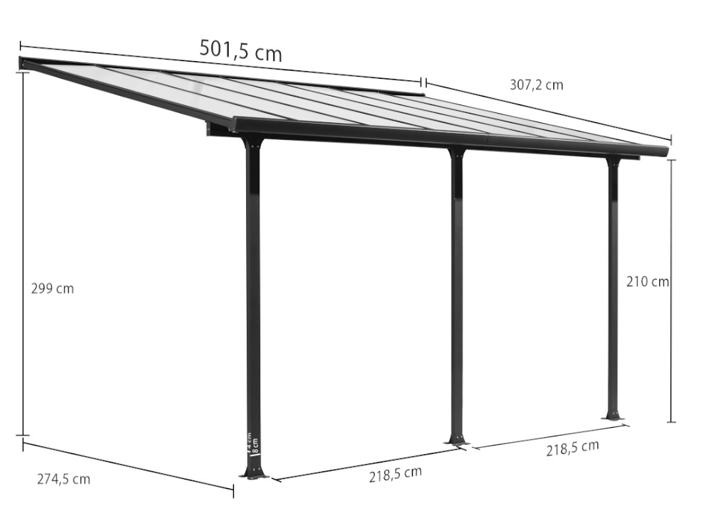 Toit terrasse fabriqué en aluminium coloris gris anthracite Dimensions hors tout l 501 x L 307 x Hauteur avant 210 cm hauteur arrière 299 cm Hauteur faîtière murale ajustable Distance ajustable entre les poteaux (vous pouvez positionner vos poteaux comme bon vous semble) Toiture en polycarbonate traité anti UV Épaisseur de la toiture de 6 mm en polycarbonate Livré avec une gouttière d'évacuation * Garantie : 5 ans contre une déformation de la structure (et non sur la finition) 2 ans sur la couverture