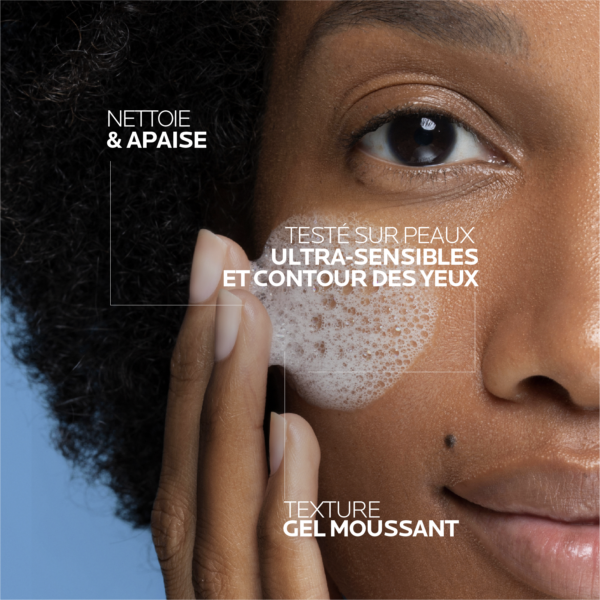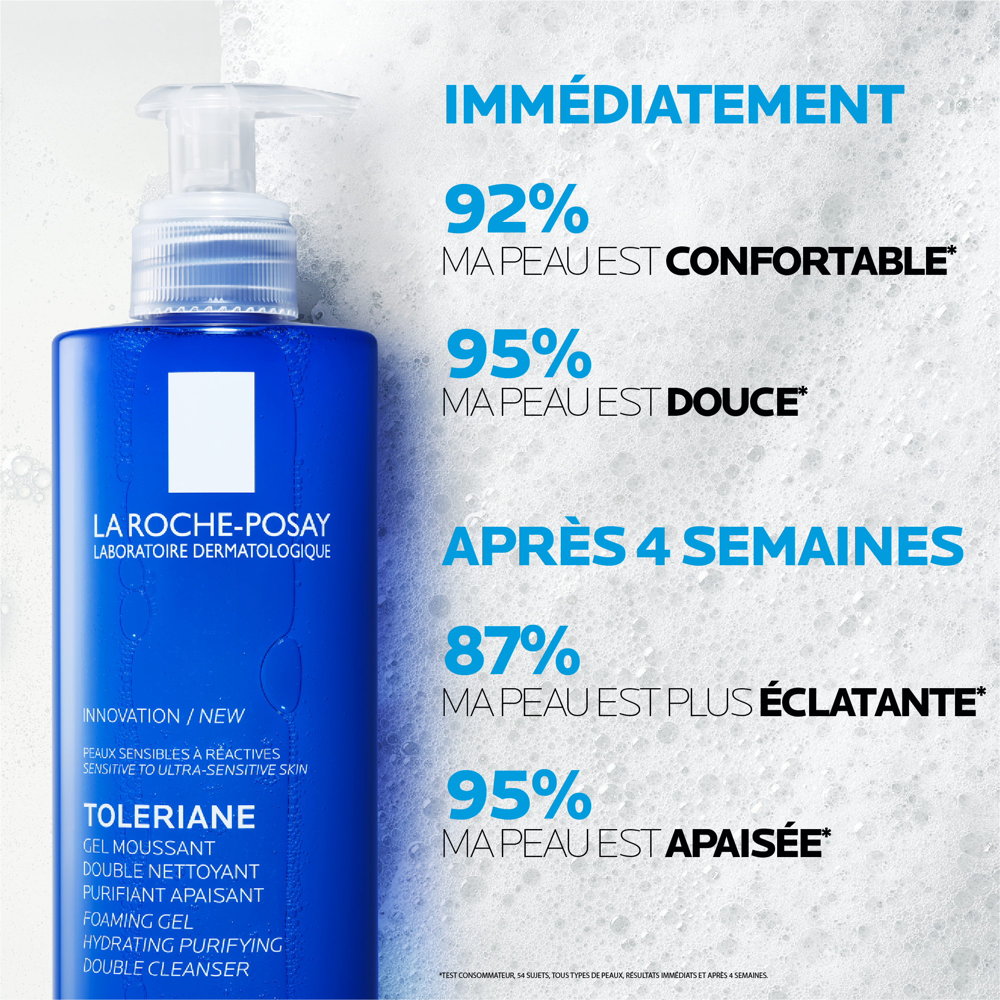 Toleriane Gel Moussant nettoie, apaise et démaquille les peaux sensibles à réactives. Convient aux yeux sensibles. Sans parfum. Testé sous contrôle dermatologique et ophtalmologique. Résultats immédiats* : 92% Ma peau est confortable 95% Ma peau est douce Résultats après 4 semaines*: 87% Ma peau est plus éclatante 95% Ma peau est apaisée * Test consommateur, 54 sujets, Tous types de peaux, résultats immédiats et résultats après 4 semaines