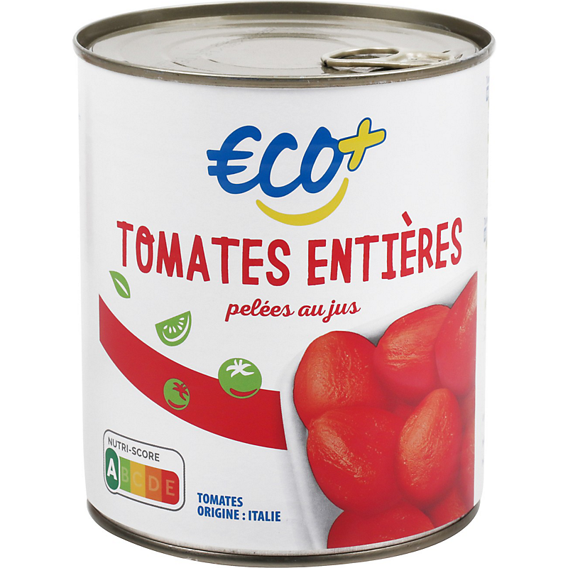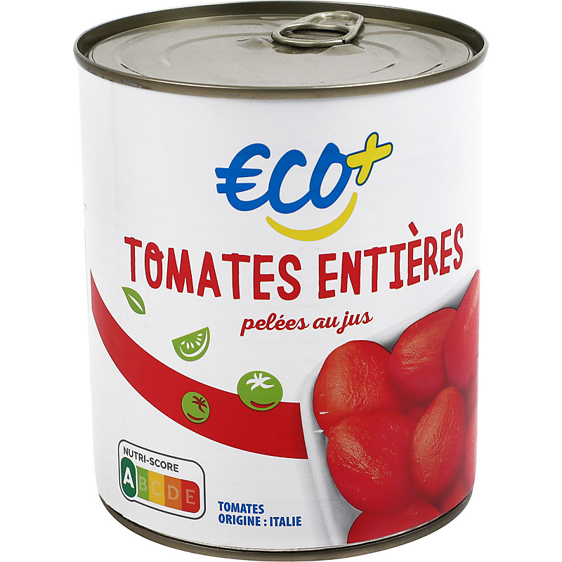 Ingrédients : Tomates entières pelées 60 %, jus de tomates 39,9 %, correcteur d’acidité : E330.
