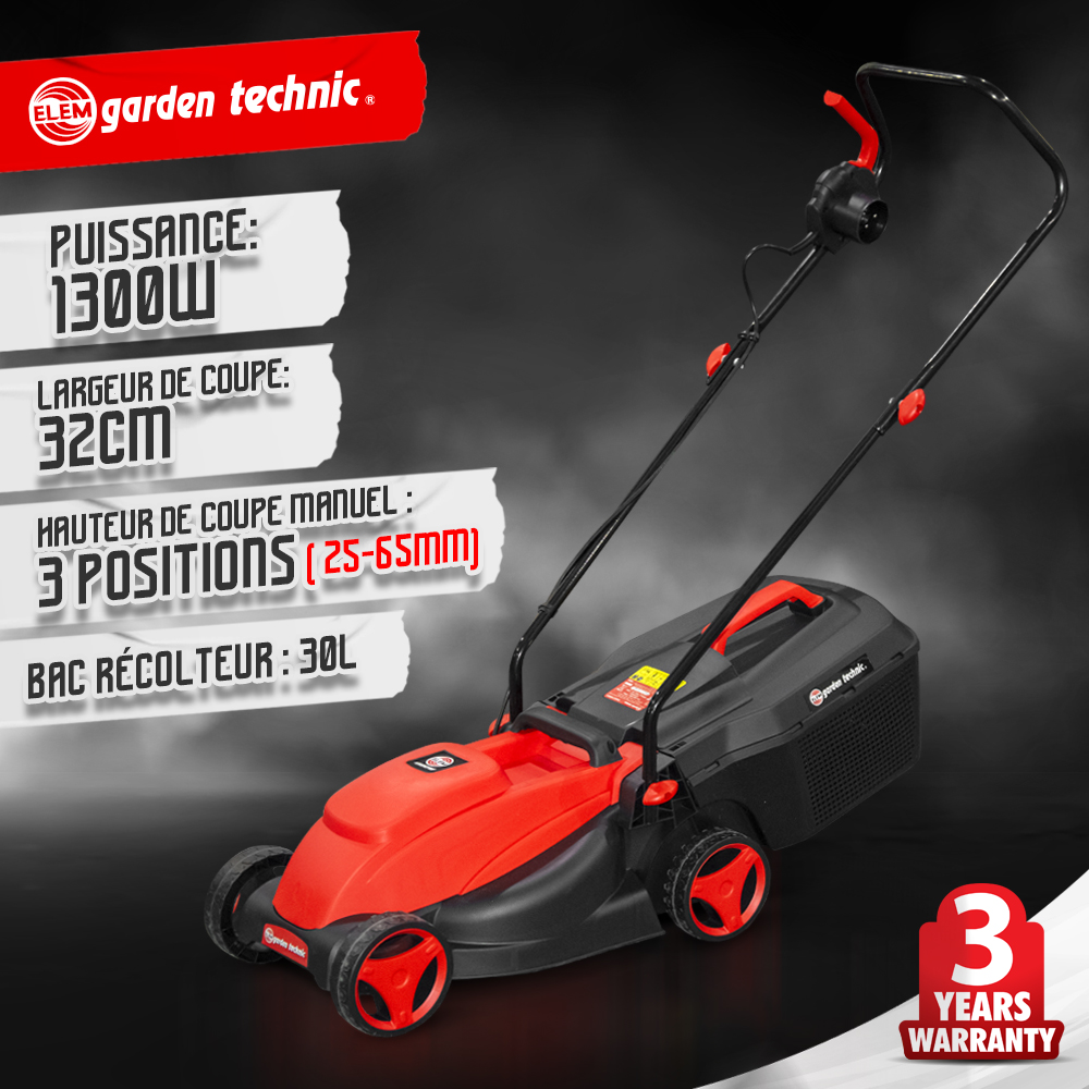 Cette tondeuse à gazon électrique de la marque Elem Garden Technic dispose d'un puissant moteur 1300 W. Performante, elle possède une largeur de travail de 32 cm ainsi qu'une hauteur de coupe réglable manuellement sur 3 positions (25 - 65 mm). Grâce à une grande poignée centrale, cette tondeuse électrique est facilement transportable. Facile à manoeuvrer, cette tondeuse électrique dispose également d'une longue durée de vie.