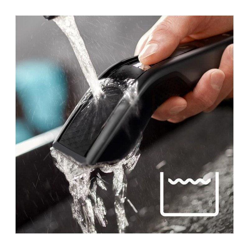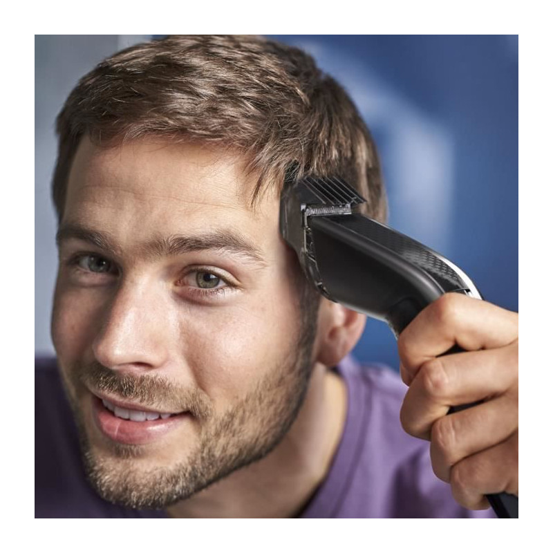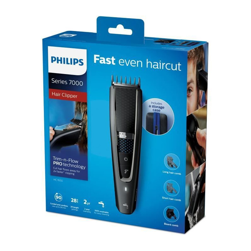 hc7650/15 - tondeuse à cheveux rechargeable + secteur - Tondeuse à cheveux Philips HC7650/15 pour une coupe de cheveux rapide et uniforme.Écarte les cheveux coupés, pour une taille 2 fois plus rapideBénéficiez d'une coupe de cheveux uniforme grâce aux technologies DualCut et Trim-n-Flow Pro. Le sabot présente un nouveau design évitant que les cheveux ne s'y accumulent, et ce quelle que soit leur longueur, pour une coupe rapide.Technologie Trim-n-Flow PROGrâce à un design de sabot innovant, les cheveux coupés s'écartent des lames lors du fonctionnement, ce qui évite aux cheveux, même longs, de s'accumuler dans le sabot, pour une séance ininterrompue, du début jusqu'à la fin.Technologie DualCutCoupez tous types de cheveux, grâce à notre technologie avancée DualCut : un élément de coupe innovant à deux tranchants coupe les cheveux deux fois plus rapidement que des lames à un tranchant.28 hauteurs de coupe verrouillablesTournez la molette pour sélectionner et verrouiller la hauteur de coupe de votre choix. Les 2 sabots réglables permettent des hauteurs de coupe comprises entre 3 et 28 mm, séparées par 1 mm chacune. Utilisez le sabot barbe de 3 jours à 2 mm pour des cheveux coupés court ou pour tailler votre barbe. Retirez le sabot pour une coupe à 0,5 mm.Utilisation avec ou sans filLa puissante batterie de la tondeuse à cheveux offre jusqu'à 90 min d'autonomie pour 1 h de charge. Pour un maximum de puissance et de liberté.Entièrement lavableLa tondeuse est étanche pour permettre un nettoyage en toute simplicité, sous l'eau du robinet. Pour qu'elle fonctionne comme au premier jour, rincez-la soigneusement à l'eau uniquement.Mode TurboAppuyez sur le bouton du mode Turbo pour augmenter la vitesse du moteur afin de couper efficacement les cheveux épais.Manche ergonomiqueLa tondeuse à cheveux Series 7000 est conçue pour être d'une utilisation agréable, d'une manipulation pratique et d'un fonctionnement simple. Sa texture spéciale et son manche ergonomique vous permettent de déplacer facilement la tondeuse sur toute la surface de votre tête.Aucun entretienGagnez du temps et évitez les contraintes grâce aux lames durables auto-affûtées, aussi coupantes au premier jour qu'au bout de 5 ans. La tondeuse est entièrement lavable pour un nettoyage simple et rapide sous le robinet.