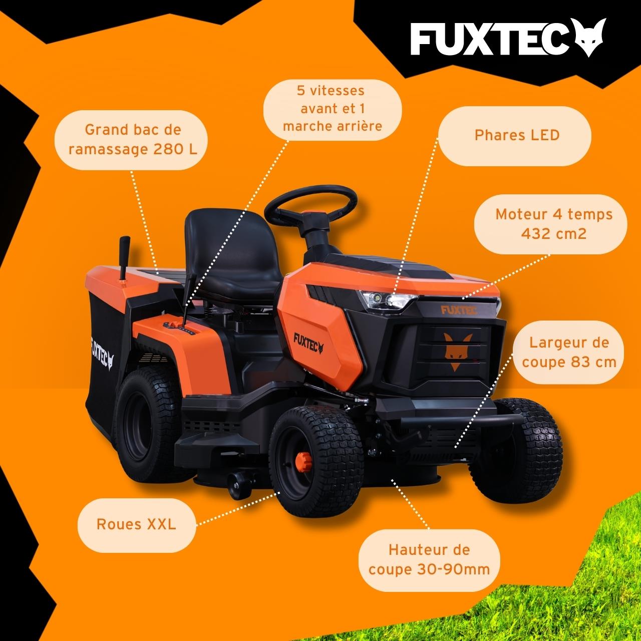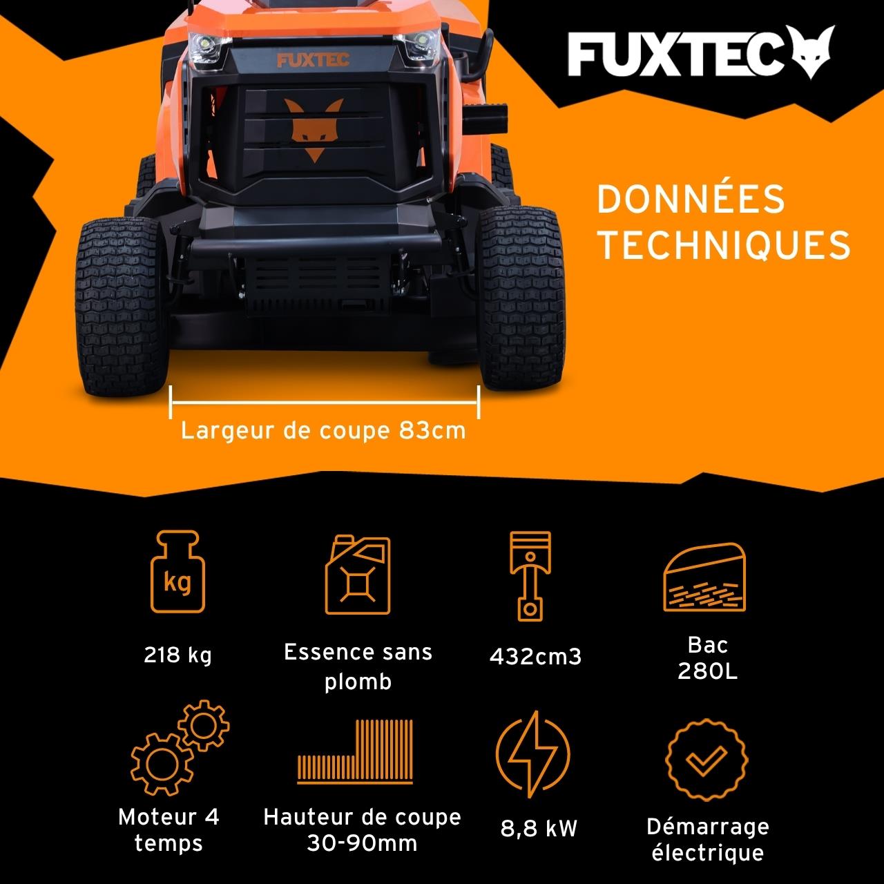 Tondeuse à gazon autoportée FUXTEC FX-RMT84M – Tracteur tondeuse – 432 cm³ – 8 kW – 83 cm – Mulching – Ba