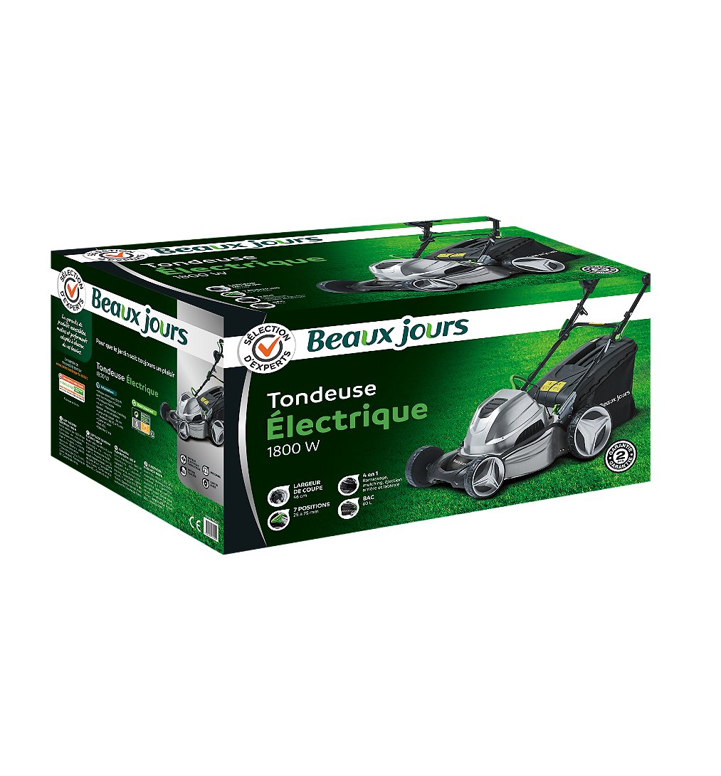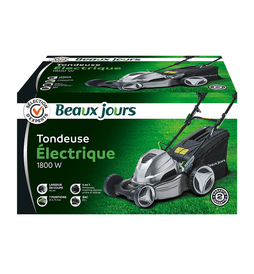 Tondeuse électrique tractée 1800W 46 cm - Sélection d'Experts - Beaux Jours -Largeur de coupe : 46 cm -Hauteur de coupe : 7 positions de 25 à 75 mm -Carter : acier -4 en 1 : ramassage, éjection arrière et latérale, mulching -Bac : 60 L -Surface de tonte conseillée : jusqu'à 1000 m² -Garantie 2 ans