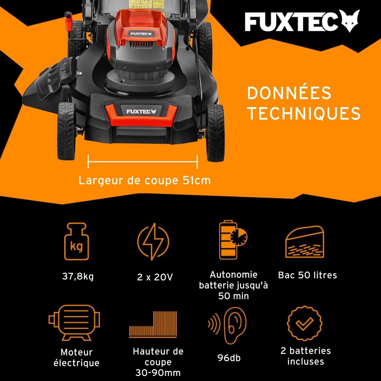 Libellé Tondeuse gazon batterie autotractée 40V (2X20V) - FUXTEC FX-E2RM51 - 51cm mulching ejection latérale 2 batteries Li-Ion 4Ah