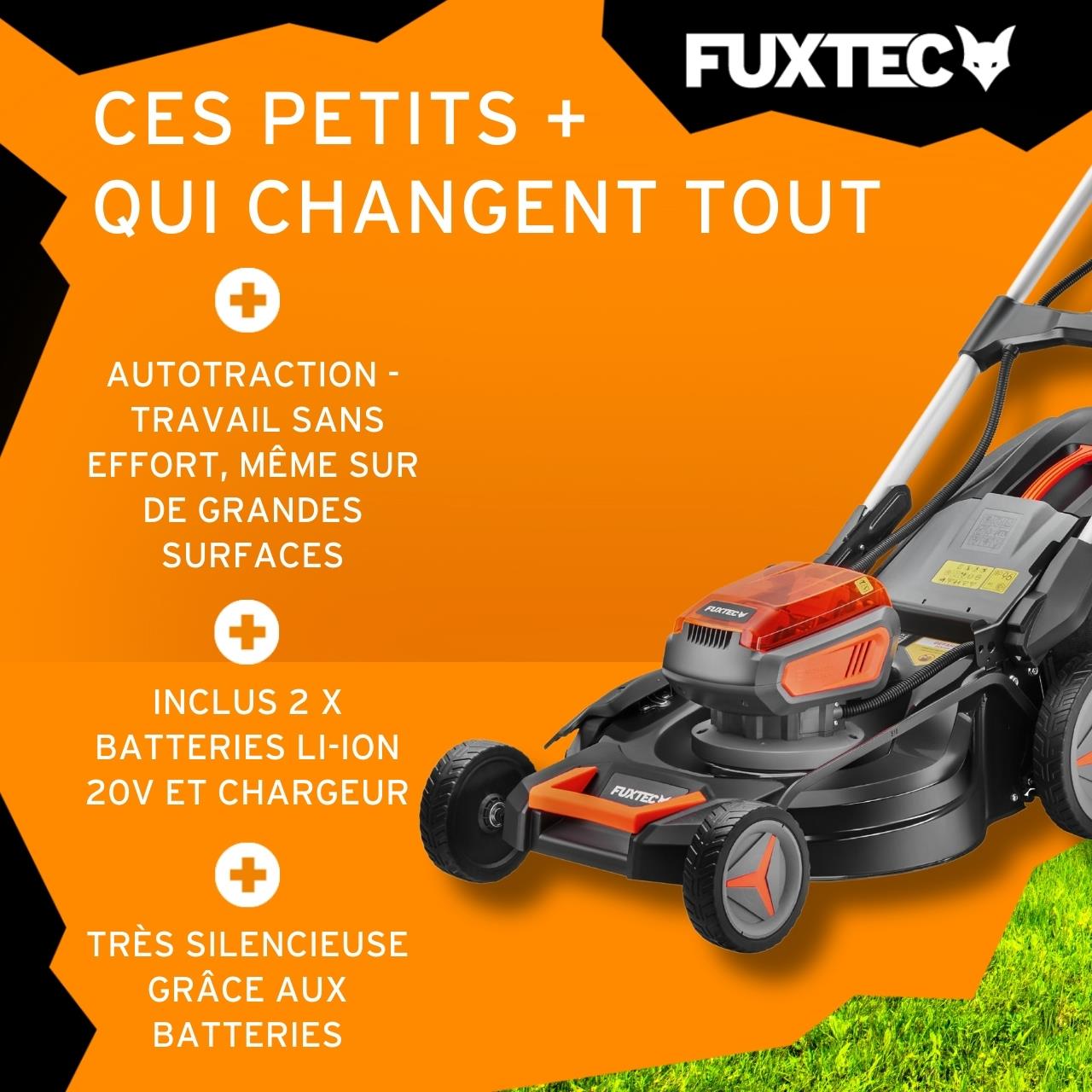 Tondeuse sur batterie autotractée avec largeur de coupe 51 cm, tondeuse sans fil pour un jardin bien entretenu. Idéale pour découvrir les outils à batterie FUXTEC ! Livrée avec chargeur et batteries.