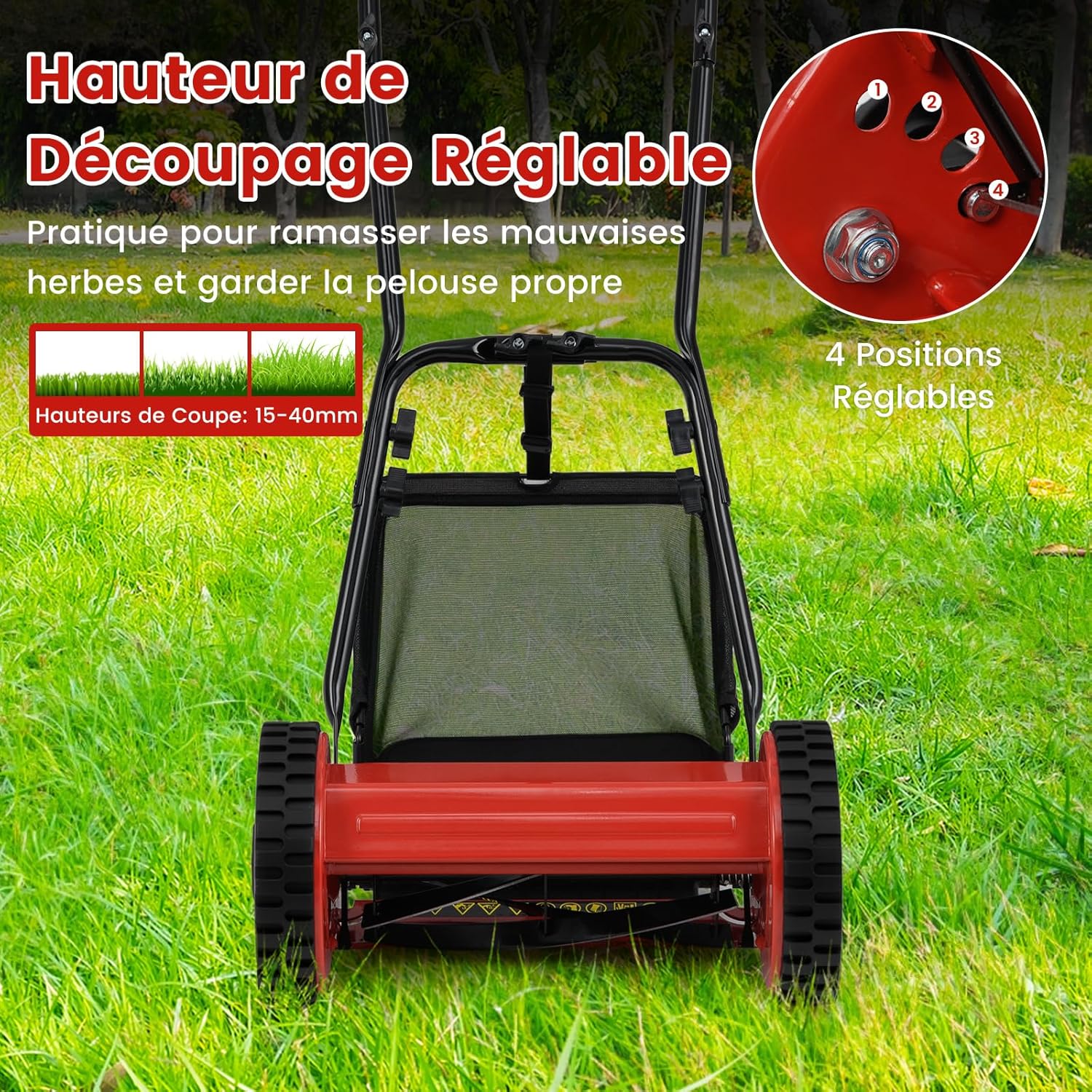 | Libellé | Tondeuse Manuelle 18,5L, Lame Tranchante, Hauteur Réglable, Poignée U, Grandes Roues, Jardin Ferme |