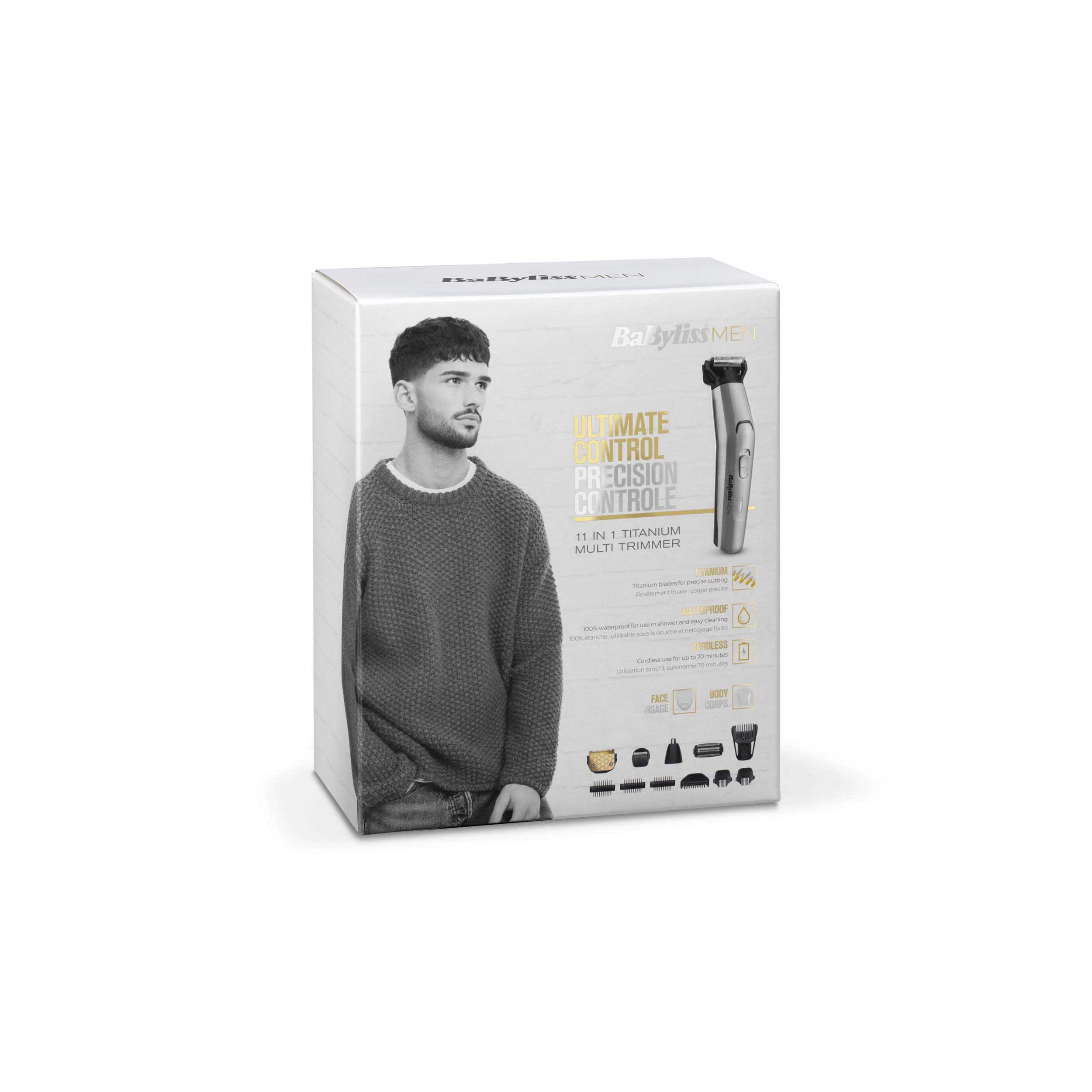 Cette tondeuse visage et corps BaByliss est très performante, pour tailler et façonner votre style. Que vous vouliez une barbe courte ou longue, entretenir vos contours, un rasage de près, façonner vos sourcils, éliminer les poils indésirables du nez ou des oreilles ou tondre votre torse, tous les looks sont possibles avec BaByliss. Lames en titane pour une tonte précise et des performances durables. Utilisation sans fil avec une autonomie de 70 minutes. 100% waterproof, elle peut être utilisée sur peau humide ou sèche. • Utilisation sans fil • 70 minutes d'autonomie • 8 heures de charge • 100% waterproof • 4x accessoires interchangeables - Tondeuse de précision en titane - Tondeuse nez/oreilles - Tondeuse de finitions - Tondeuse corps • Guide de coupe cheveux réglable • Guide de coupe barbe (2-14 mm) • Guide de coupe ajustable (1-3,5 mm) • 2 x Guides de coupe sourcils (3 et 5 mm) • 3 x Guides de coupe corps (3, 5 et 7 mm) • Têtes lavables • Pochette de rangement • Garantie 3 ans