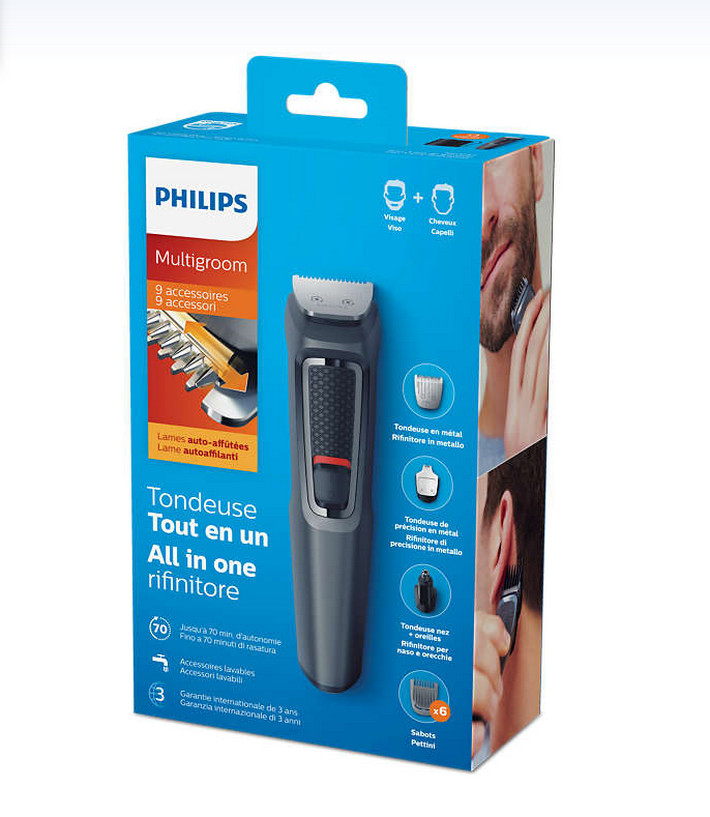 mg3740/15 - tondeuse multifonction rechargeable - Changez de style à tout moment avec cette tondeuse Philips MG3740/15 tout-en-un robuste. Ses 9 outils de qualité vous permettent de styliser facilement et avec précision votre visage et votre coiffure.Lames auto-affûtées respectueuses de votre peau, pour une coupe impeccable.Votre coupe est impeccable à chaque fois. En se frottant légèrement l'une contre l'autre, les lames en inox s'auto-affûtent pendant qu'elles coupent, ce qui leur permet de rester aussi aiguisées au premier jour qu'au bout de 3 ans d'utilisation.Taillez et stylisez votre barbe et vos cheveux avec 9 outils.Cette tondeuse tout-en-un très pratique taille et stylise votre barbe et coupe vos cheveux.Tondeuse en métal pour la barbe et les cheveux.Utilisez la tondeuse en métal sans sabot pour obtenir une barbe, une nuque et des cheveux aux contours impeccables. Les lames auto-affûtées de la tondeuse restent aussi aiguisées au premier jour qu'au bout de 3 ans d'utilisation.Tondeuse de précision en métal définissant les contours de votre barbe ou bouc.Affirmez ou changez votre style avec précision en dessinant des lignes et contours et en peaufinant les moindres détails.Tondeuse nez-oreilles éliminant les poils du nez et des oreilles.Éliminez les poils indésirables du nez et des oreilles, facilement et en douceur.6 sabots pour le visage et les cheveux.2 sabots barbe de 3 jours (1, 2 mm), 1 sabot barbe réglable (3-7 mm) et 3 sabots cheveux (9, 12, 16 mm).Jusqu'à 70 min d'autonomie par charge.Autonomie de 70 min pour 16 h de charge.Accessoires rinçables pour un nettoyage facile.Il vous suffit de détacher les lames et sabots pour les rincer sous le robinet et les nettoyer soigneusement.Trousse facilitant le rangement et les transports.La trousse est pratique pour le rangement et les déplacements. Elle accueille et protège votre tondeuse et tous ses outils lorsque vous êtes en déplacement.