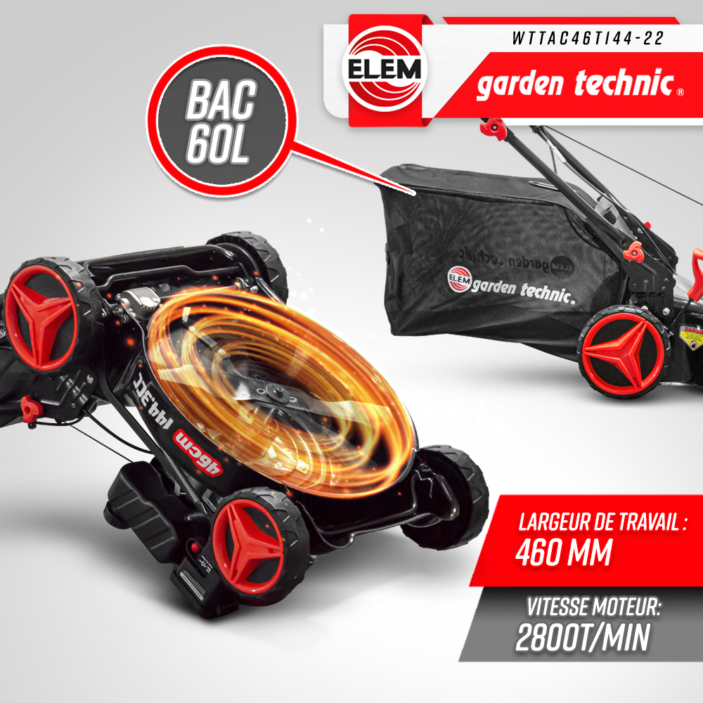 | Libellé | Tondeuse thermique autotractée 144.3cc - Largeur de coupe 46cm - Elem Garden |