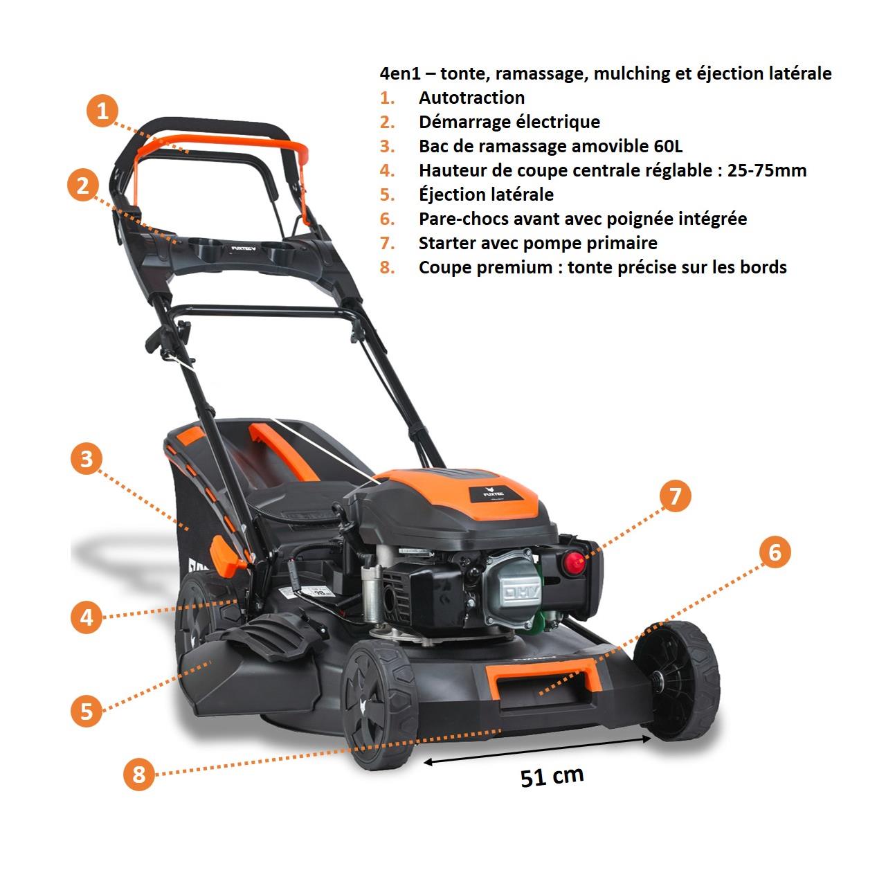 Tondeuse thermique autotractée 170cm3 51cm - FUXTEC FX-RM5170eS - démarrage électrique 60 L Easy Clean
