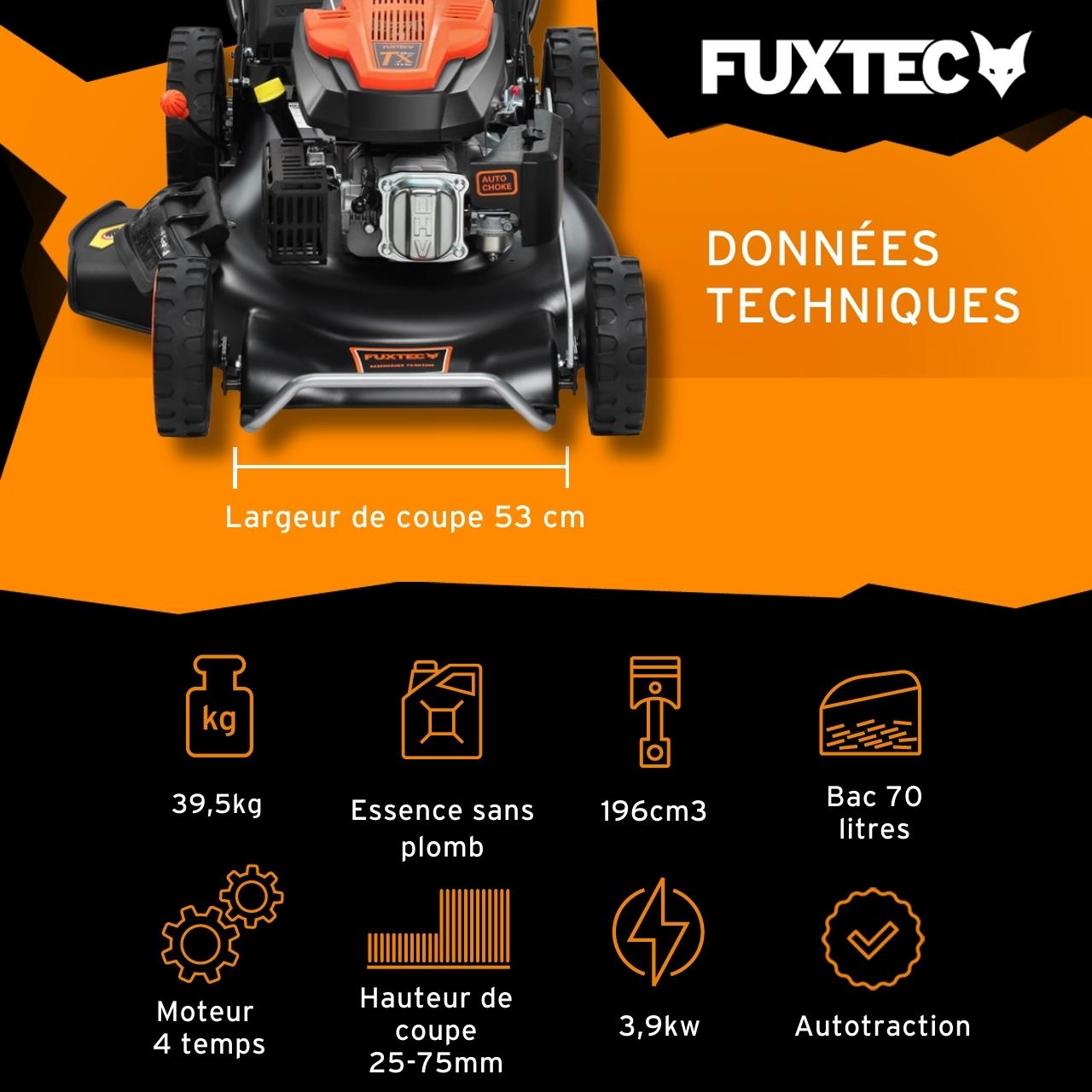 | Libellé | Tondeuse thermique autotractée 196cm3 53cm - FUXTEC FX-RM5396 - 6CV 70L |