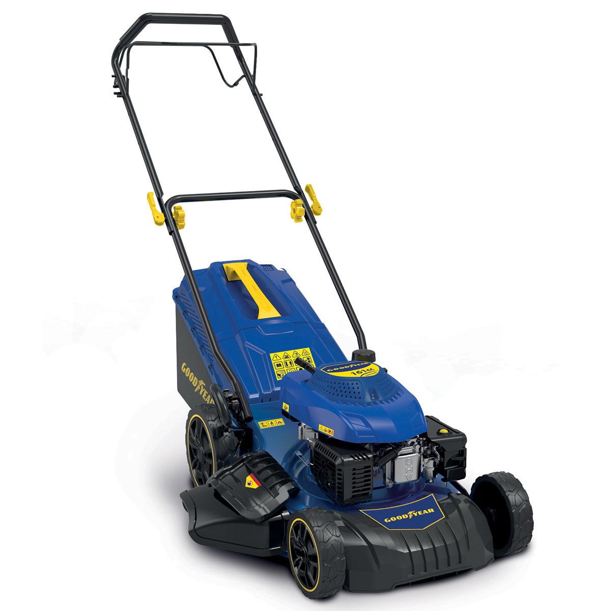 La tondeuse thermique Goodyear 161 cm³ possède un plateau de coupe de 46 cm, en acier, avec des roues arrière de 26 cm pour des performances exceptionnelles. La traction rend le travail de tonte encore plus efficace sur n'importe quelle pelouse.