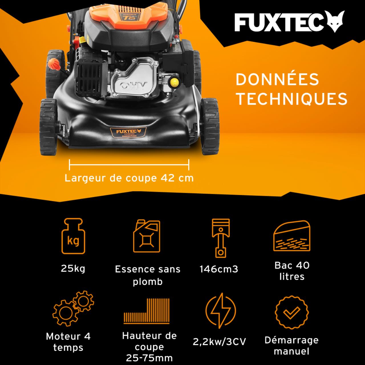 | Libellé | Tondeuse thermique poussée 42cm 146cm3 - FUXTEC FX-RM4346ECO - 3,5CV Easy Clean |