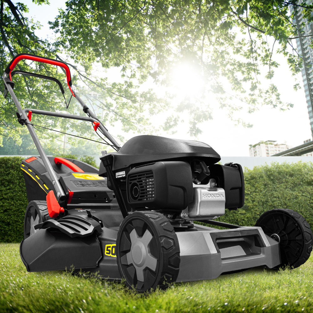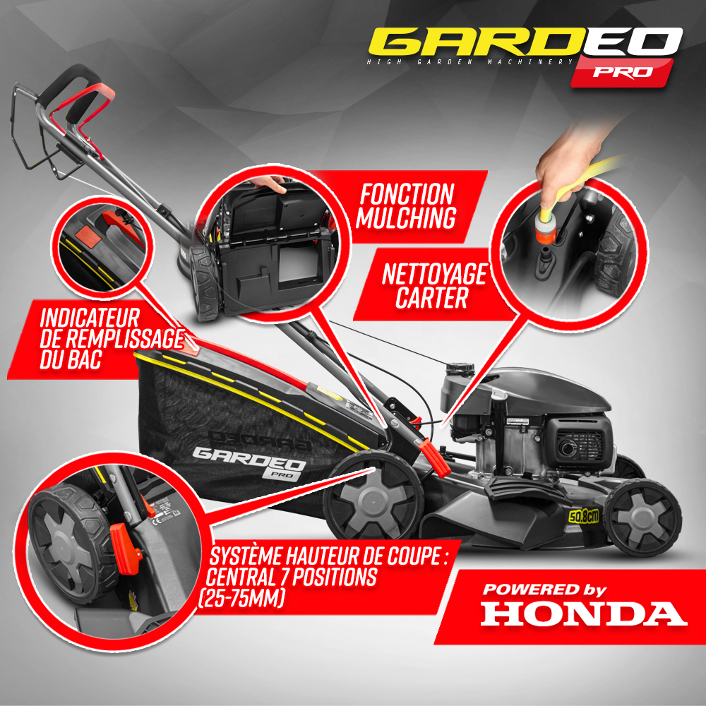 Cette tondeuse thermique autotractée équipée d'un moteur Honda GCV170 est parfaite pour les personnes à la recherche d'un outil puissant et rapide. Grâce à sa largeur de travail de 508 mm, elle est adaptée à la tonte de moyen ou grand terrain. Elle vous offrira un travail parfait grâce à son système de réglage centralisé sur 7 positions permettant d'adapter facilement la hauteur de coupe. Munie d'une poignée « soft grip », elle vous offre un confort et une prise en main irréprochable. Elle possède également une poignée à l'avant pour faciliter le transport. Cette tondeuse à essence dispose d'un carter en acier résistant aux chocs. Elle est équipée d'un bac récolteur souple avec hard top renforcé de 60 litres afin de vous éviter un grand nombre de trajets jusqu'au compost. Cette tondeuse dispose des fonctions suivantes : Fonction Mulching (Cette fonction vous sera utile si vous souhaitez tondre et fertiliser votre jardin en même temps. Cela améliorera l'aspect ainsi que la santé de votre gazon.) - Éjection arrière - Éjection latérale - Nettoyage du carter intégré - moteur Easy start (démarrage simple et facile sans avoir à amorcer le moteur). Garantie : 5 ans Caractéristiques : - Moteur Honda GCV 170 easy start (démarrage simple et facile sans avoir à amorcer le moteur). - Puissance: 167 CC / 3.4Kw - Capacité du réservoir essence: 1 L (95/98 oct sans plomb) - Capacité du réservoir huile: 0,41 L (SAE 20W-40) - Largeur de travail : 508 mm - Auto-tractée - Système hauteur de coupe : central 7 positions (25 - 75 mm) - Type de carter : Acier - Capacité du bac : 60 L (bac souple avec hard top renforcé) - Roues avant : 170mm - Roues arrière : 225mm - Éjection arrière - Fonction mulching - Éjection latérale - Poignée soft grip - Système de nettoyage du carter intégré - Poignée à l'avant de la tondeuse pour un transport aisé