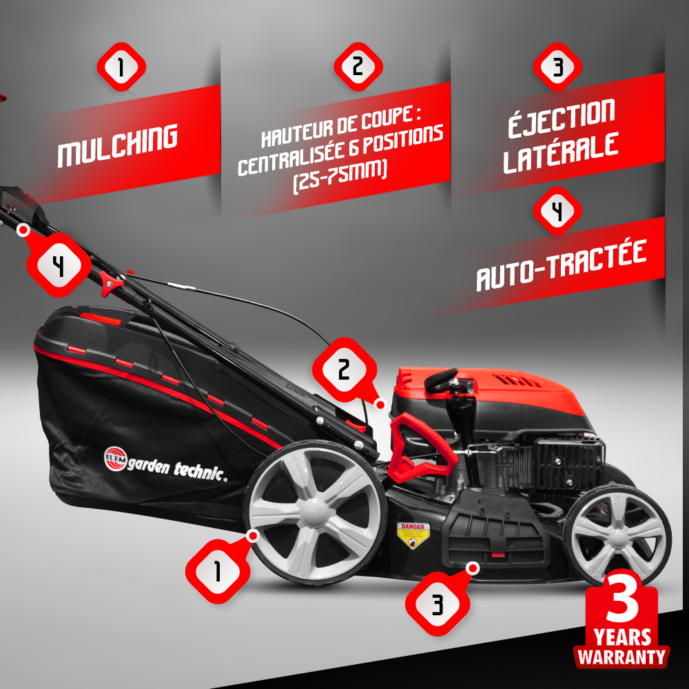 Cette tondeuse thermique tractée 173 CC de la marque Elem Garden Technic est légère, maniable et donc très simple d'utilisation. Elle convient pour tous types de terrains d'une surface conseillée de 1800m².