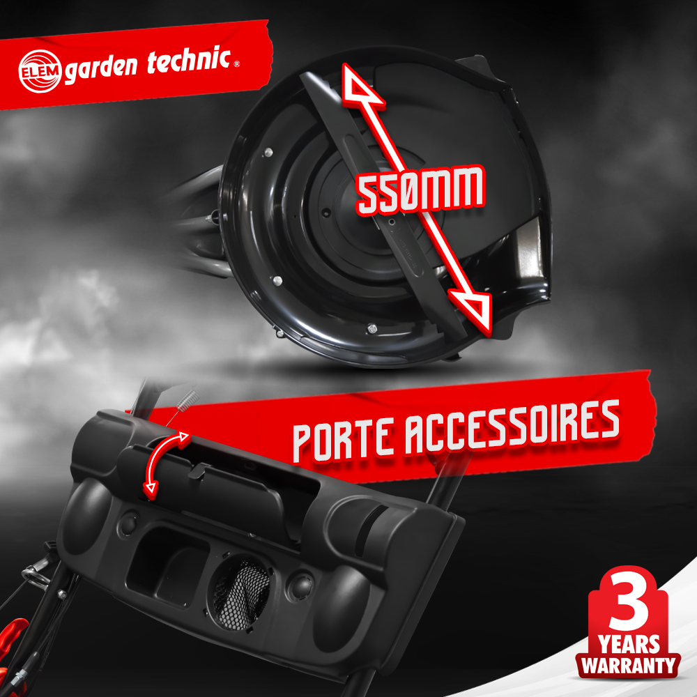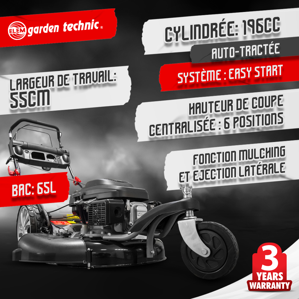 | Libellé | Tondeuse thermique tractée 3 roues 196cc - 55cm - 65L - Elem Garden |