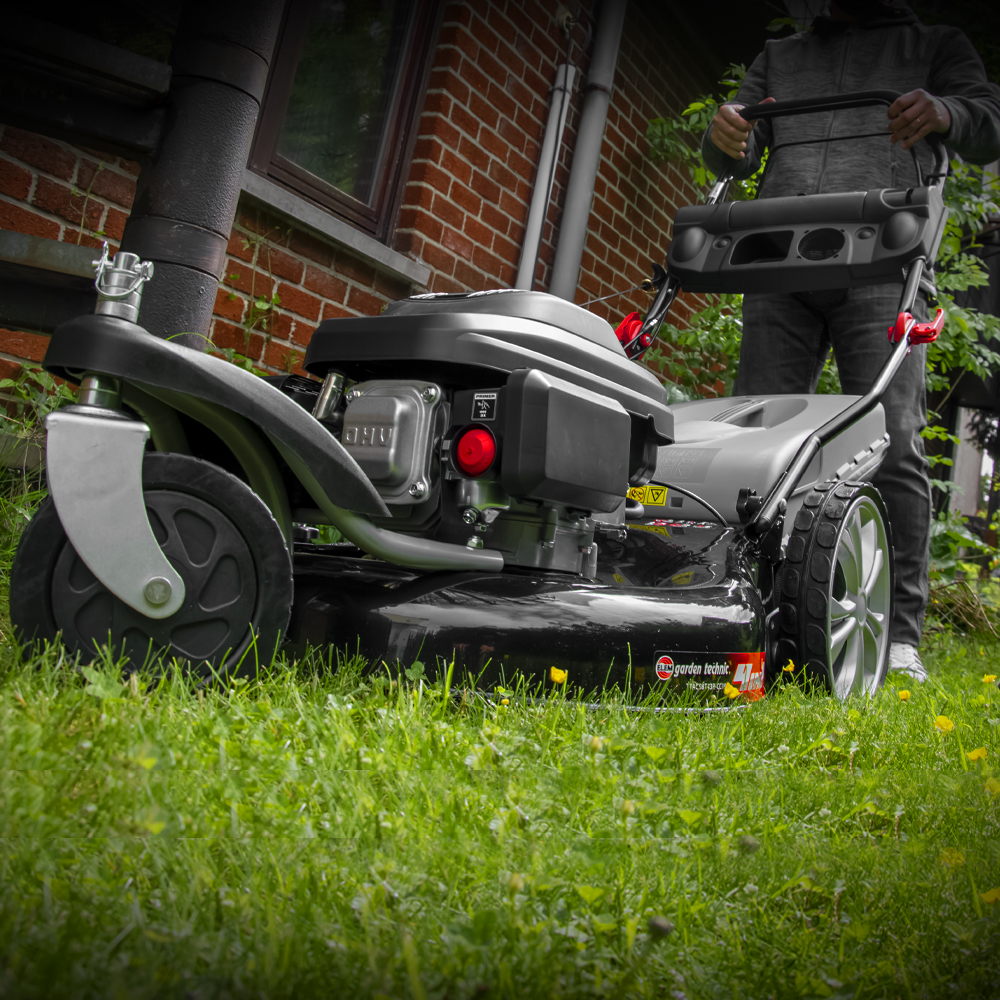 Cette tondeuse débroussailleuse thermique tractée 196 CC de la marque Elem Garden Technic est très maniable grâce à sa roue avant pivotante à 360°, elle vous permettra de tondre sans aucun souci autour des arbres et dans les courbes.
