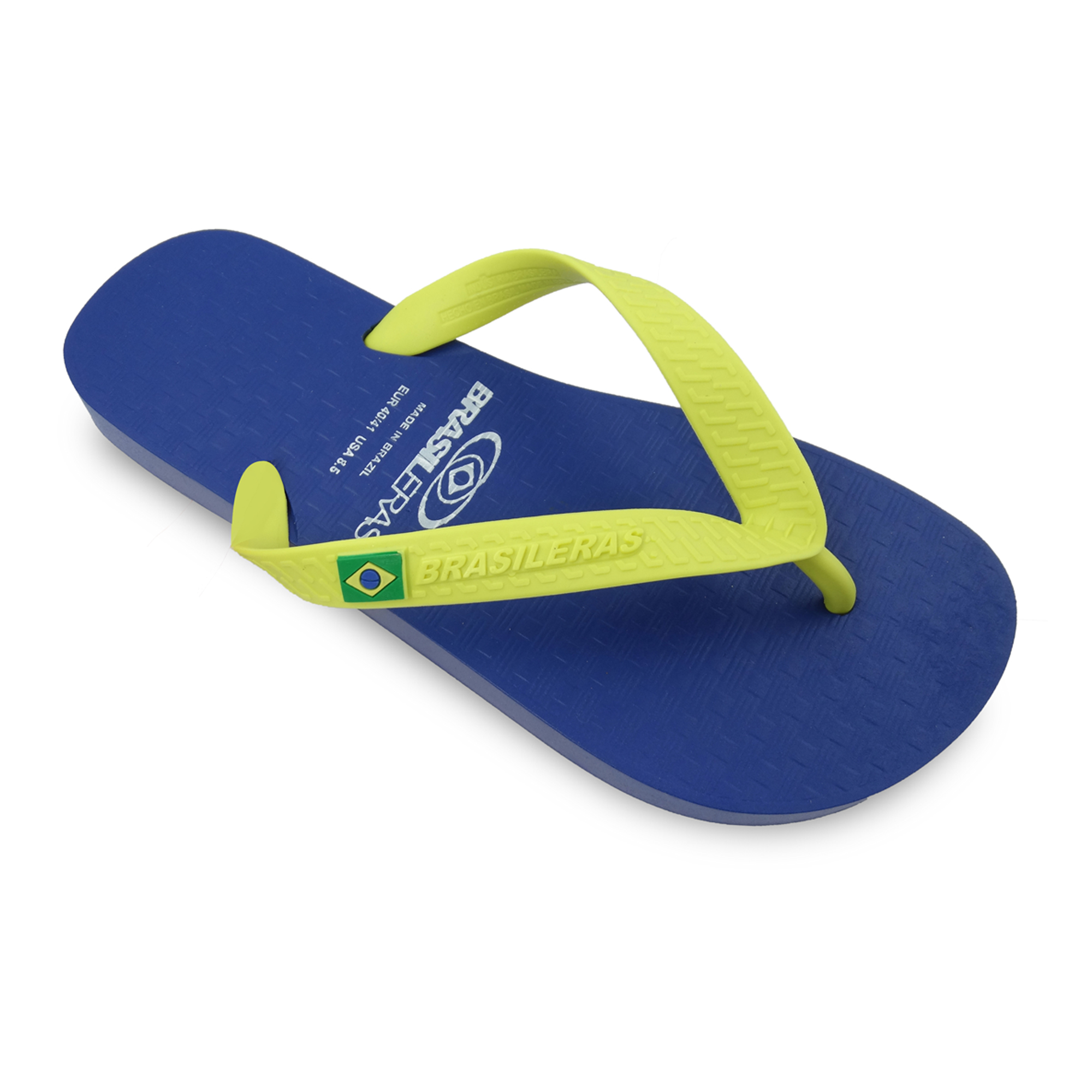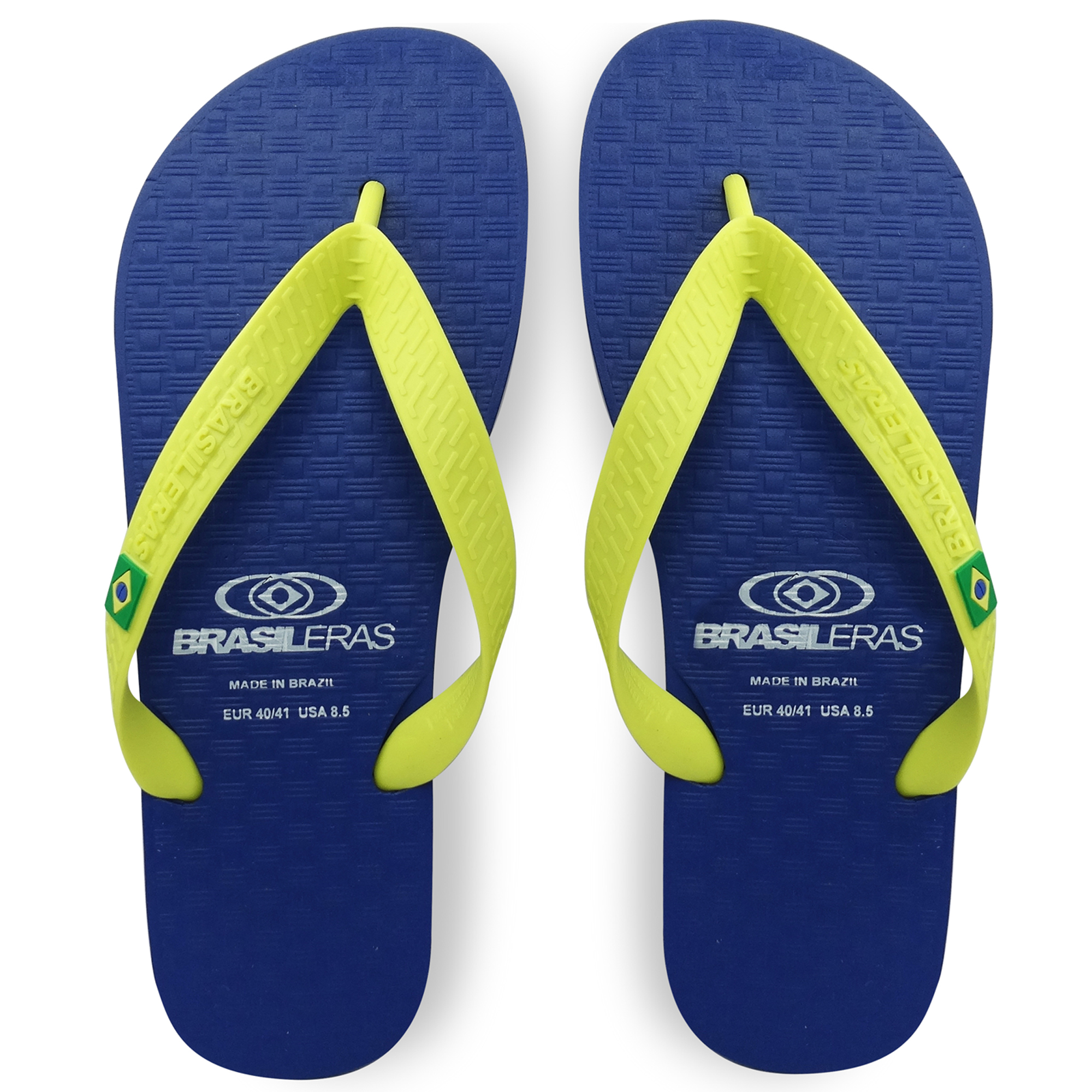 Tongs de plage brasileras unisexes bleues et jaunes avec semelles en caoutchouc antidérapantes.