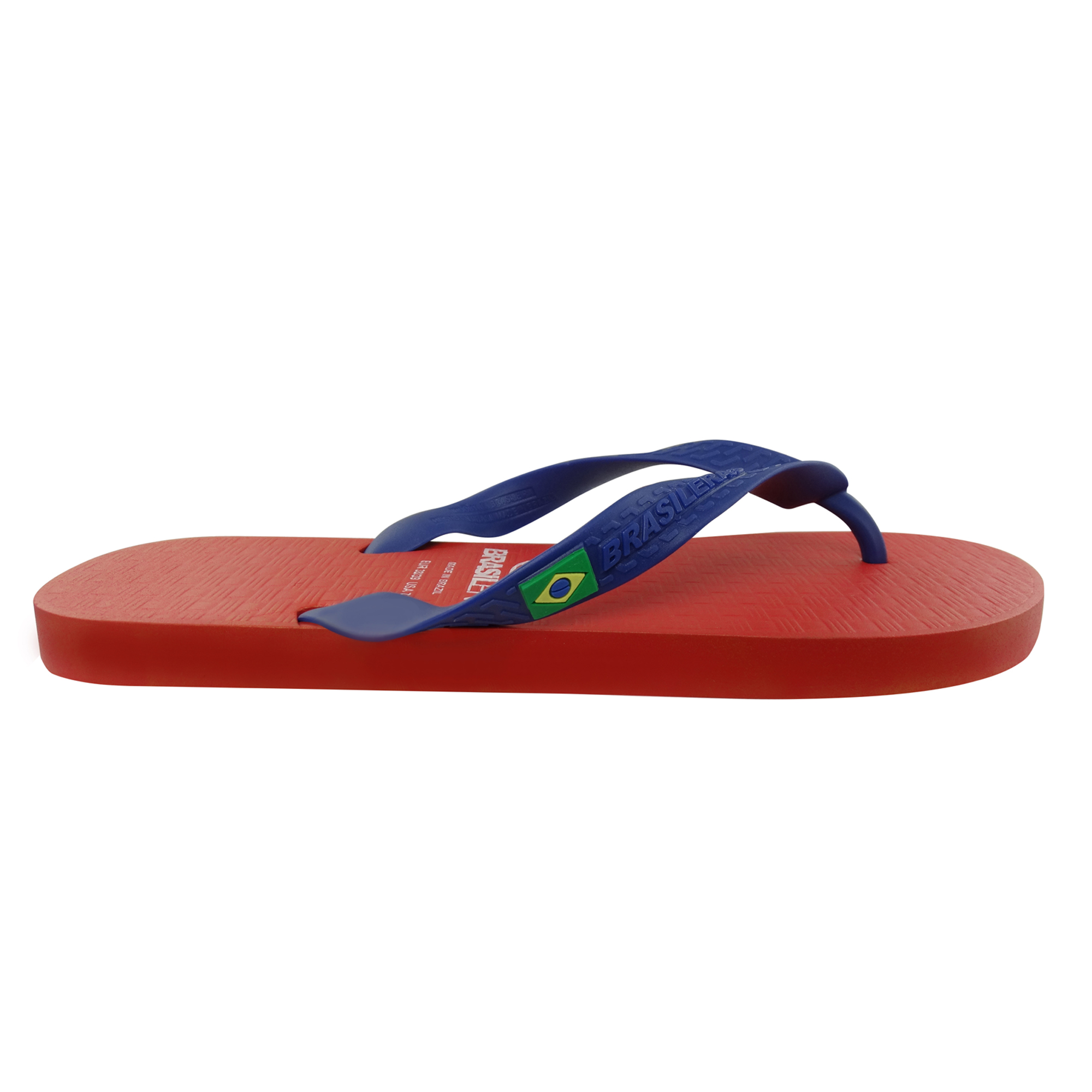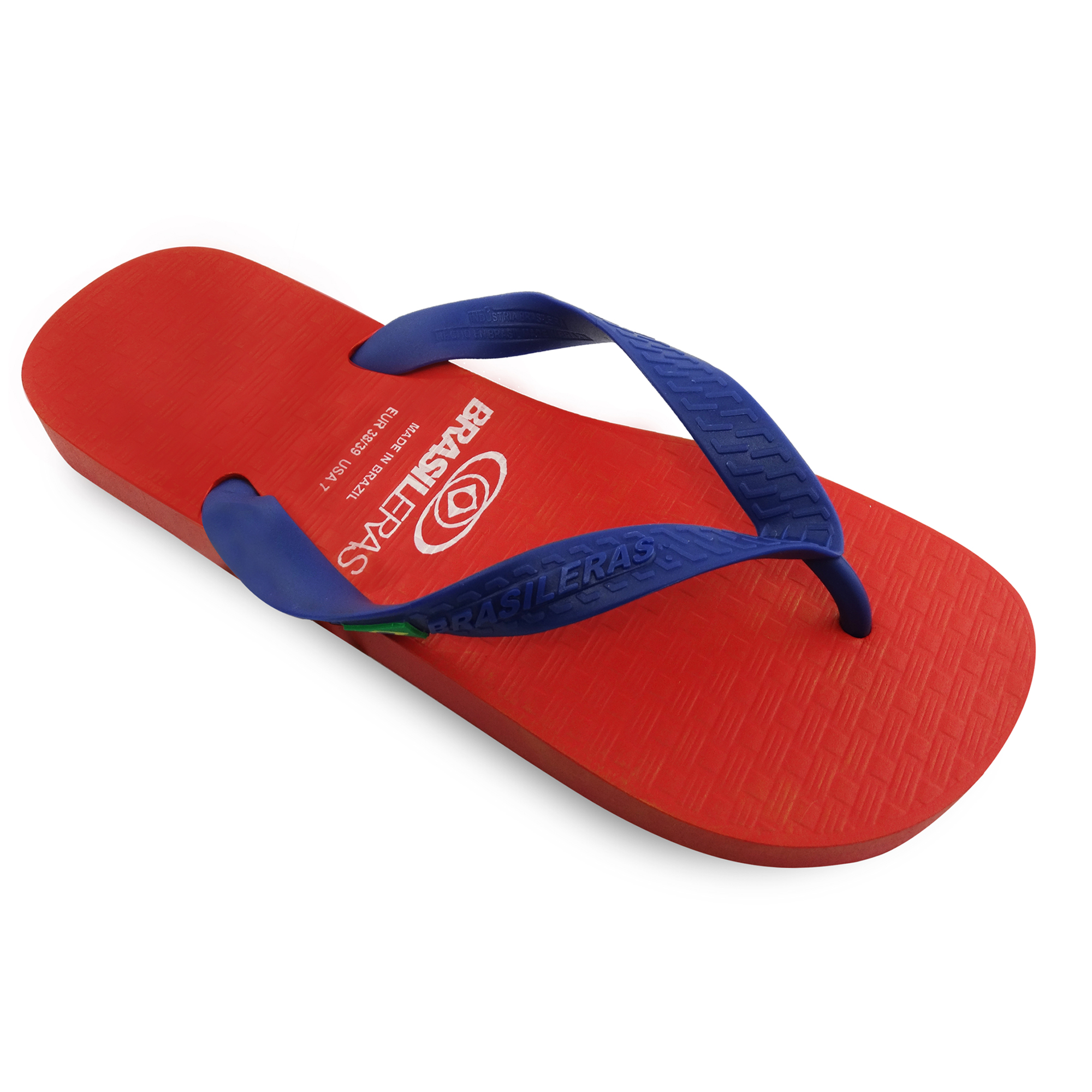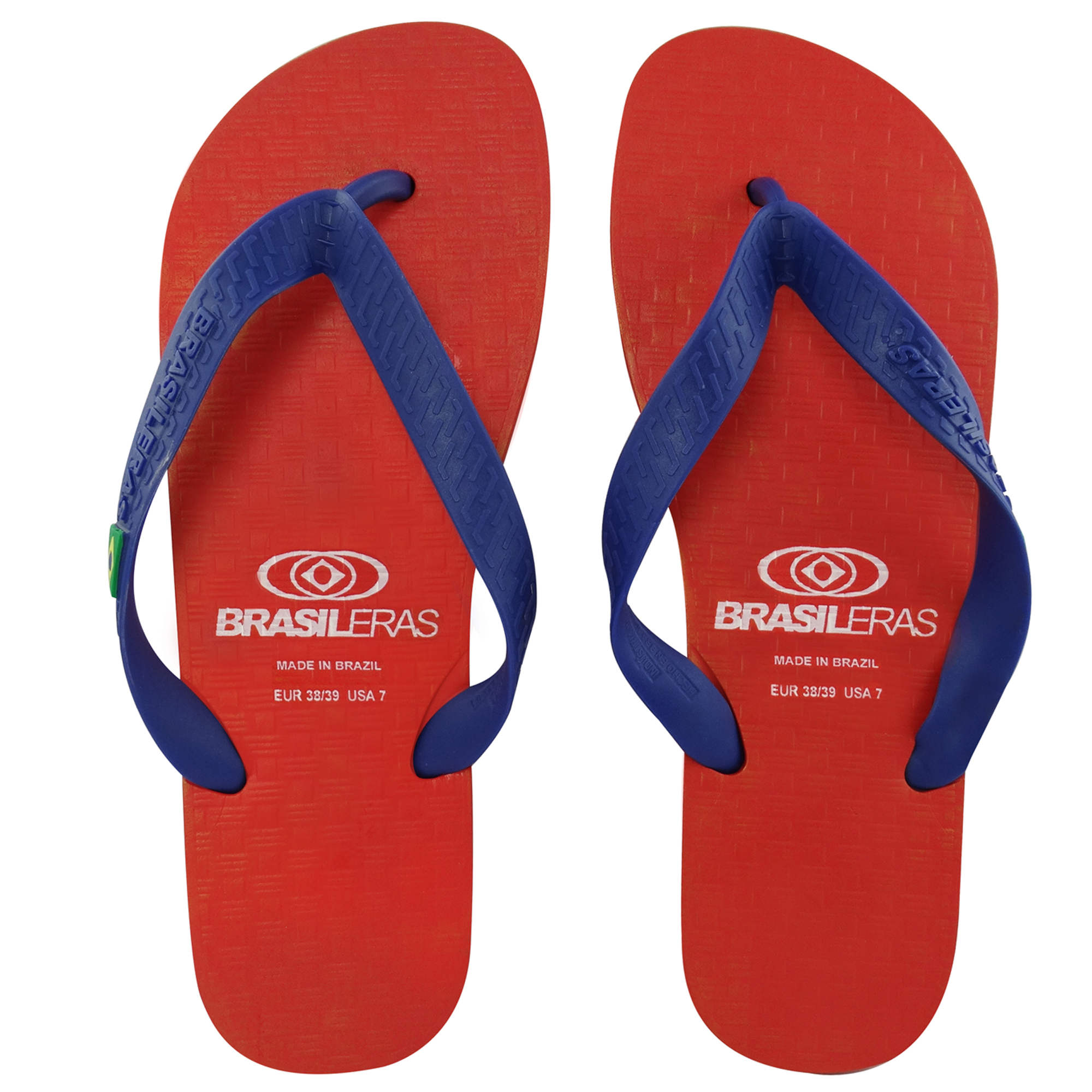 Tongs de plage brasileras unisexes rouges et bleues avec semelles en caoutchouc antidérapantes.