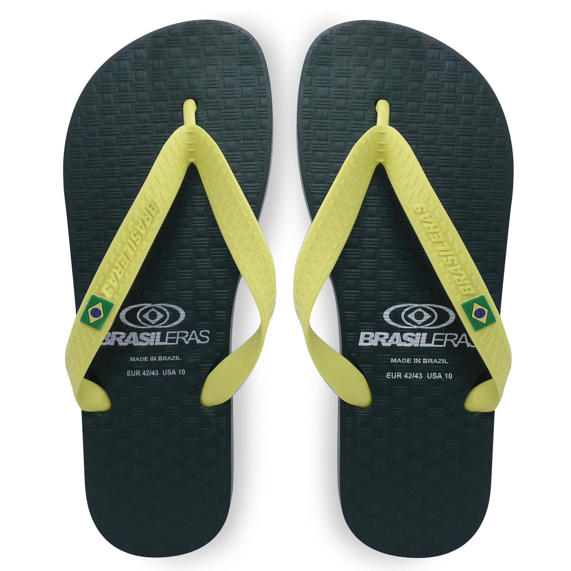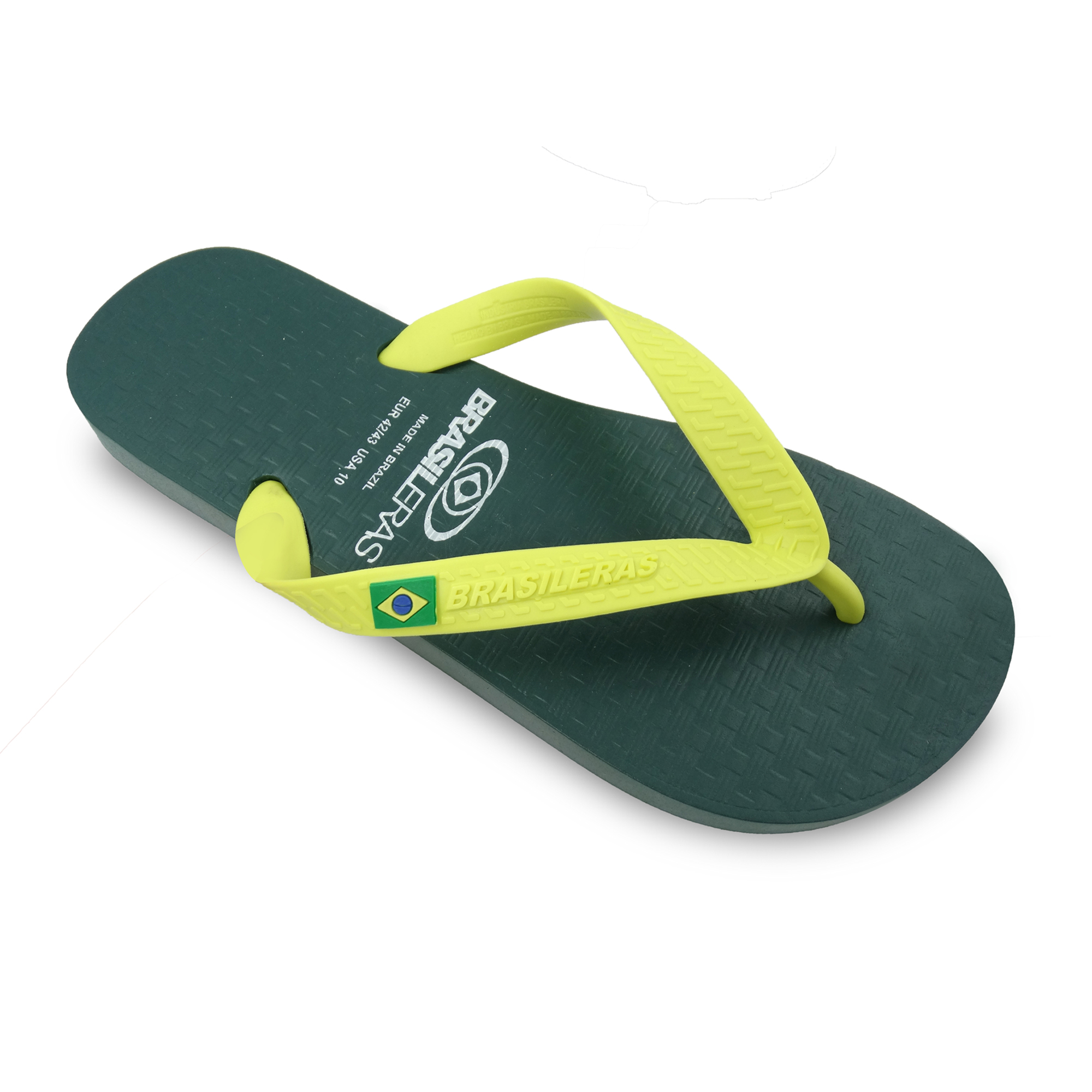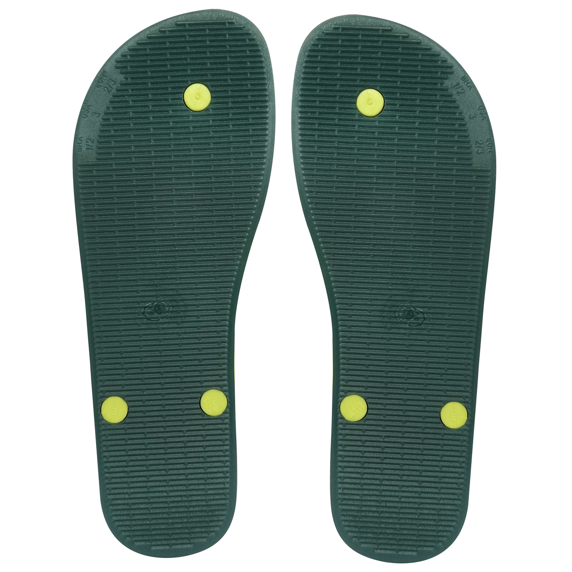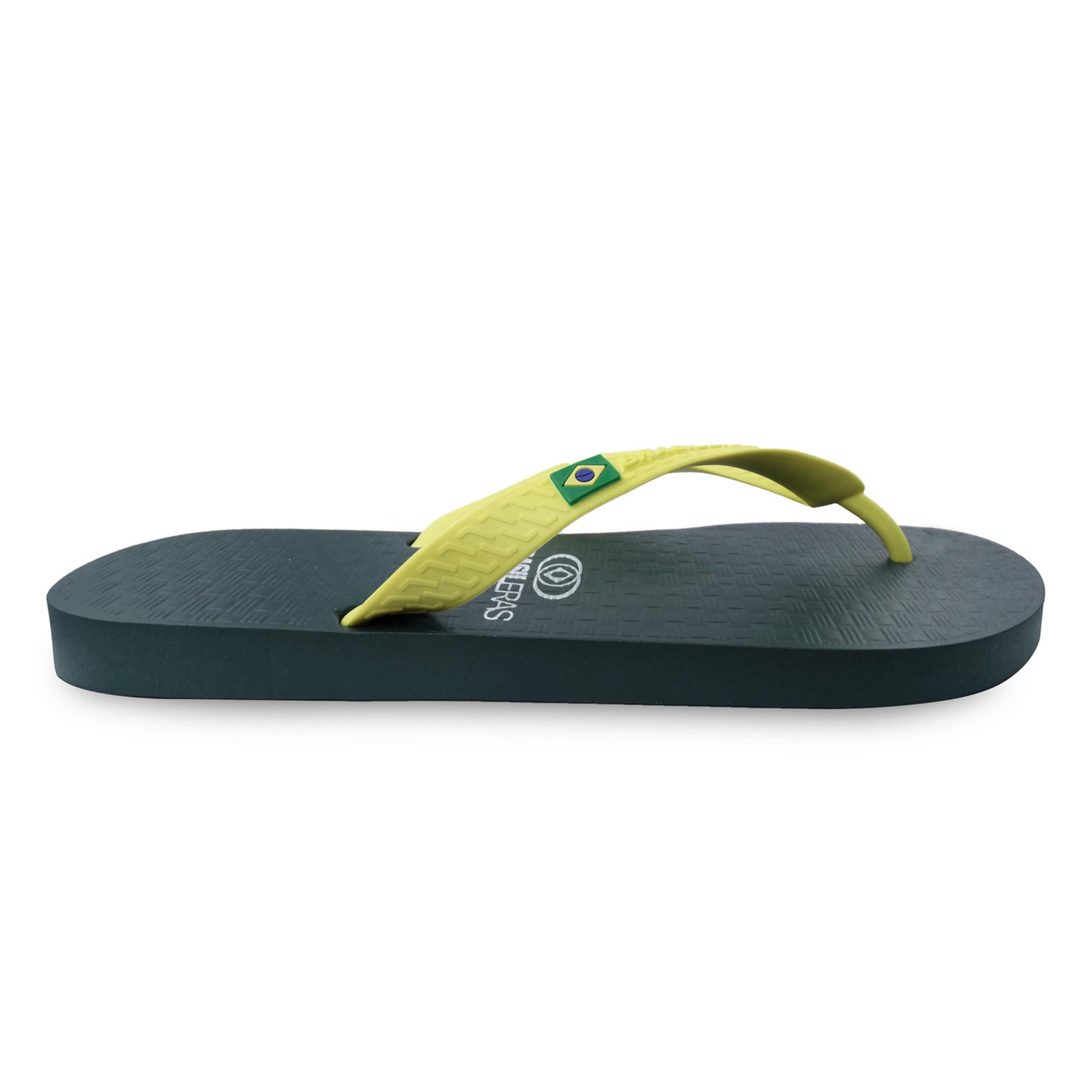 Tongs de plage brasileras unisexes vertes et jaunes avec semelles en caoutchouc antidérapantes.