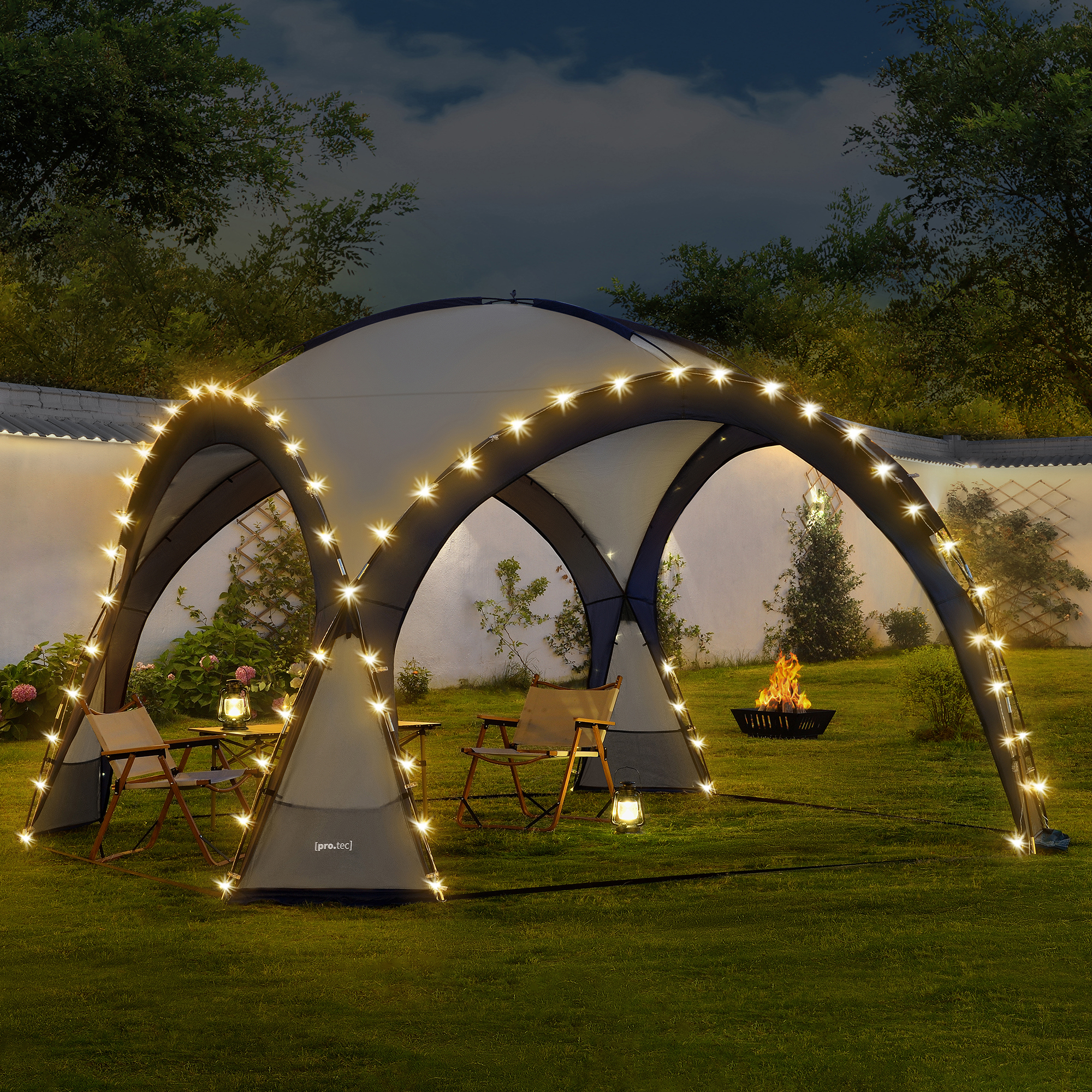 Cette tente peut être installée rapidement et simplement pour abriter une réunion de famille ou une réception d'amis. L'éclairage LED permet de créer une ambiance agréable et festive le soir, tandis qu'en journée, la matière imperméable vous protège contre les intempéries et les forts rayons de soleil.