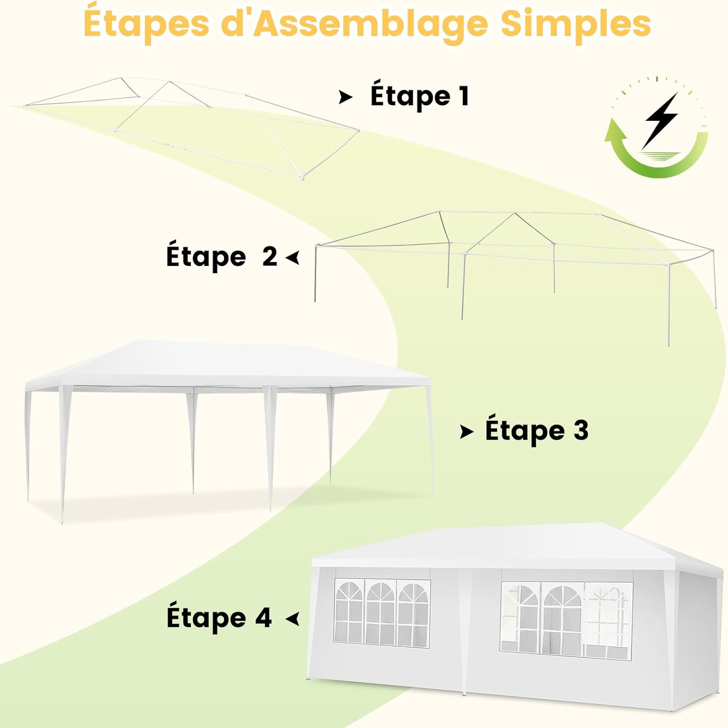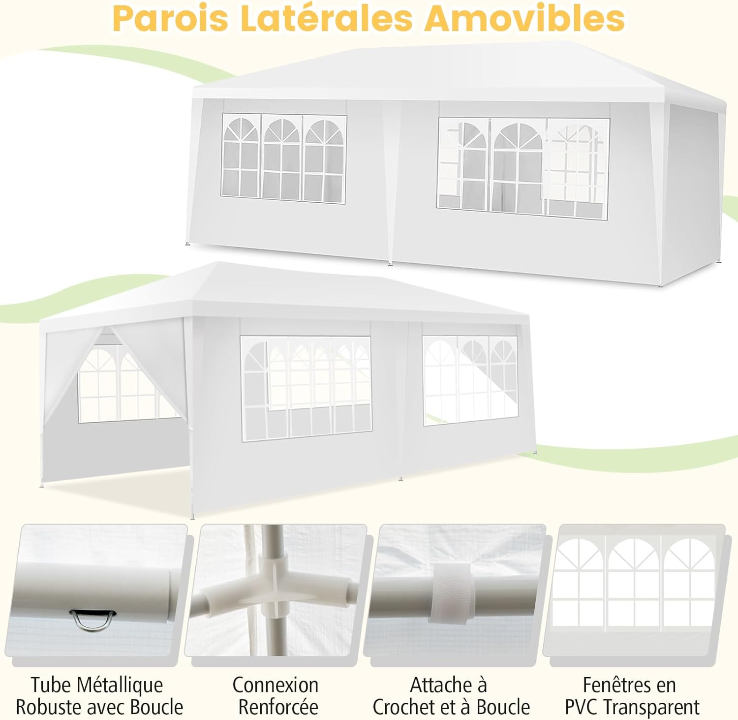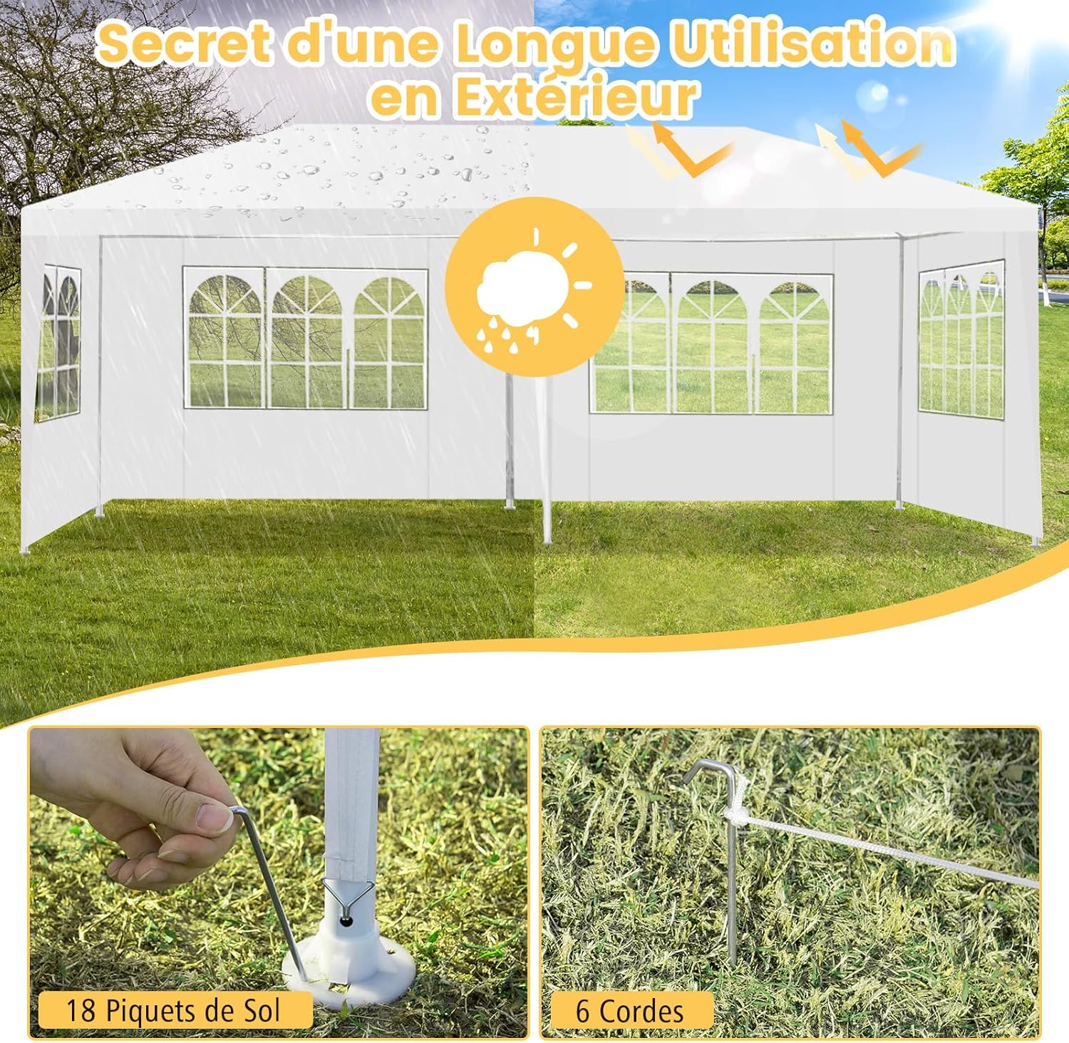 | Libellé | Tonnelle de jardin 3 x 6 m avec 4 murs amovibles, fenêtre sur côté, piquets de terre, sac de transport |