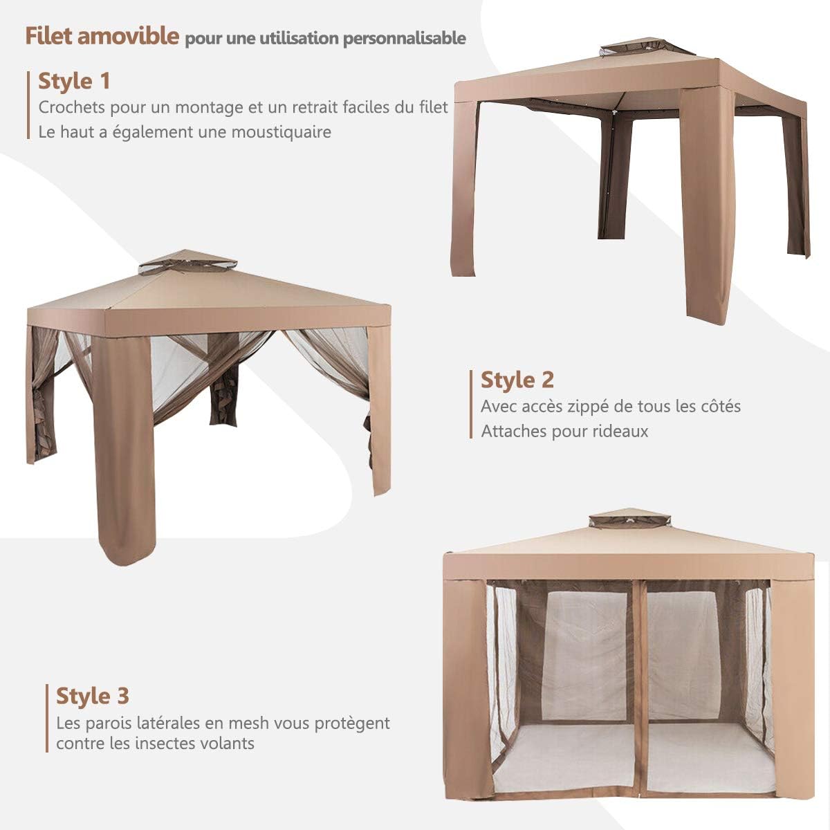 Tonnelle de jardin en polyester anti UV, tente réception double toit avec 4 moustiquaires zippées (Brun)