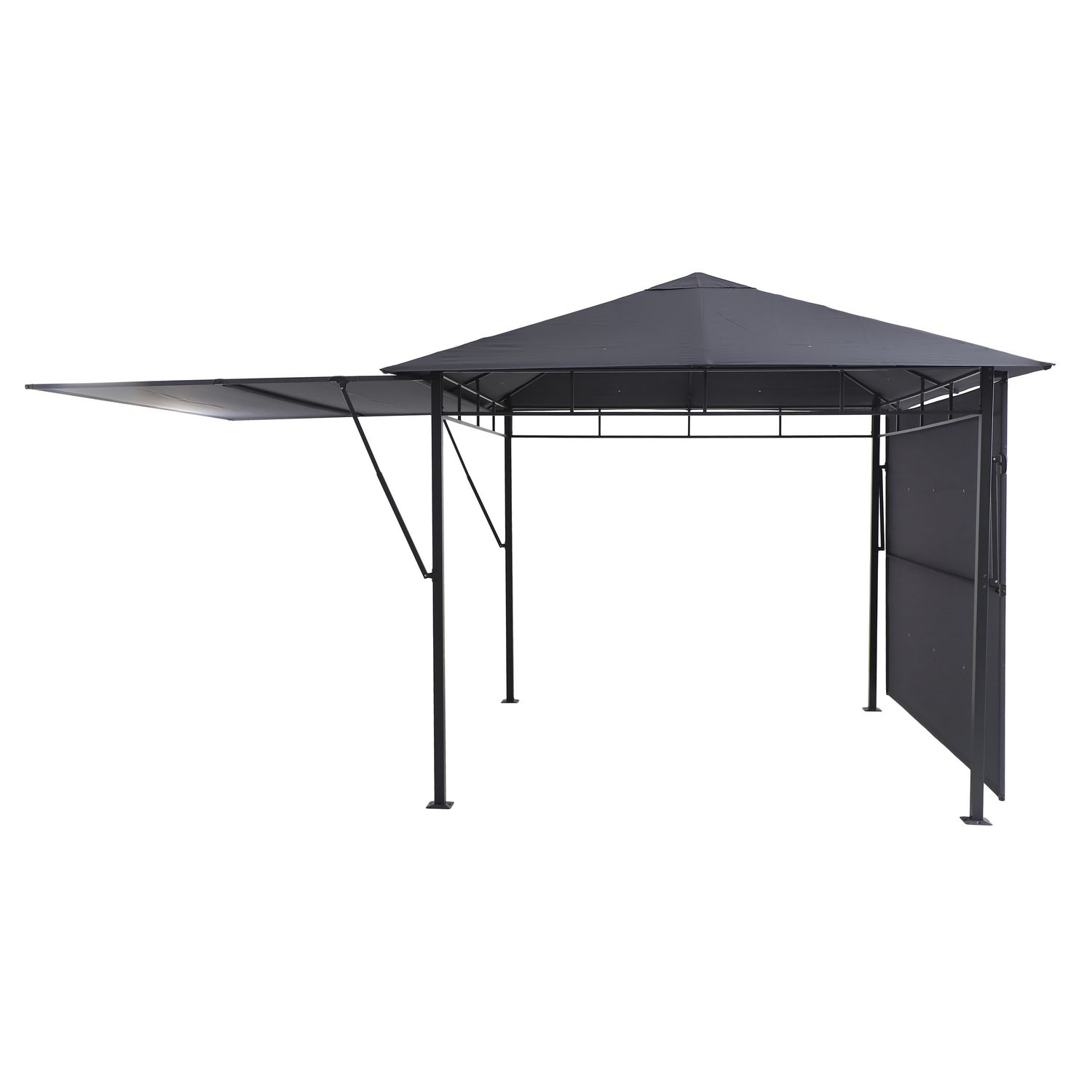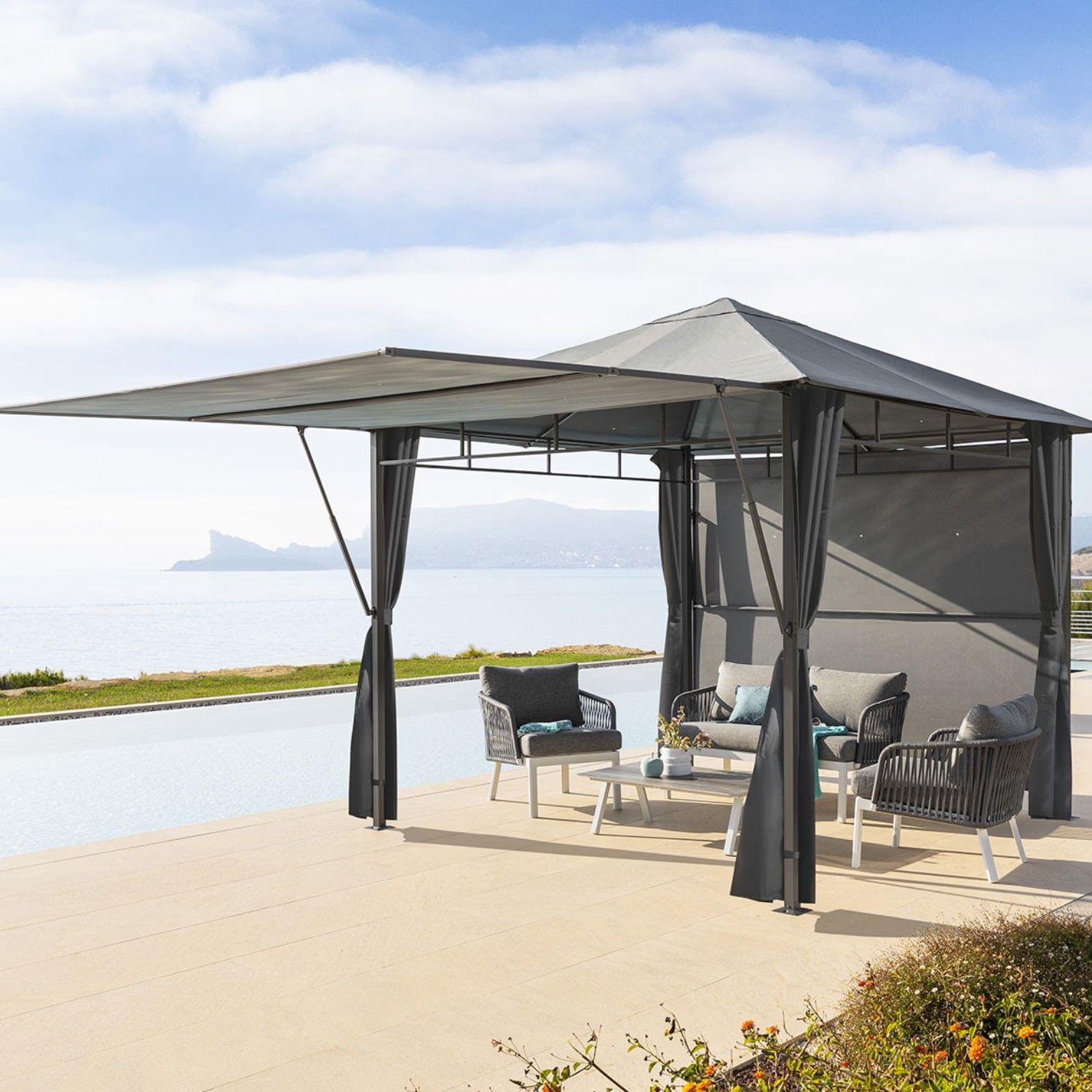 Ajoutez une zone d'ombre agréable sur votre terrasse avec la tonnelle Omelya Hespéride. Très élégante et épurée, la tonnelle Omelya se fondra facilement dans votre décor extérieur. Vous pourrez prendre un repas à l'abri avec vos proches. La cheminée d'aération permet à l'air de circuler pour une atmosphère plus agréable. La tonnelle Omelya possède deux auvents rabattables qui vous protègeront des courants d'air et des regards indiscrets. La solide structure en aluminium traité époxy résiste à la rouille et à la décoloration due aux UV. Le tissu déperlant évite que l'eau de pluie ne pénètre dans la matière.