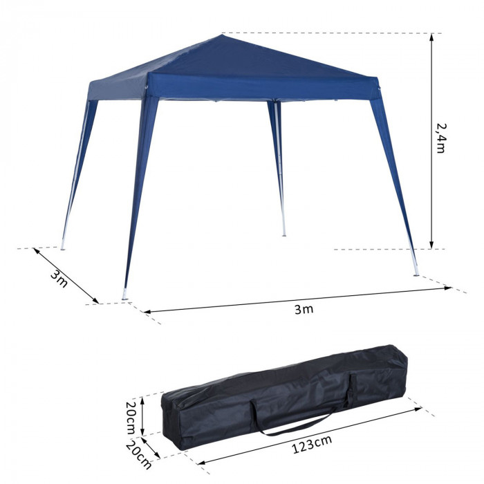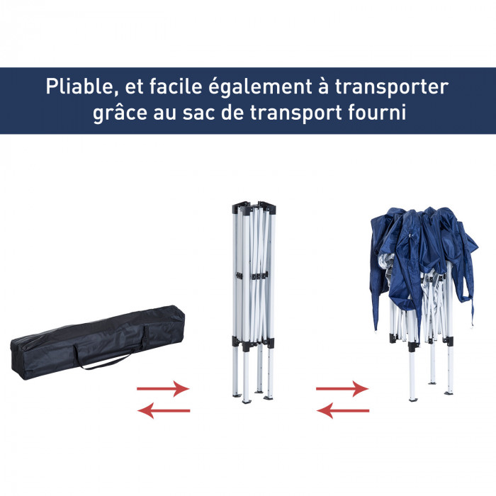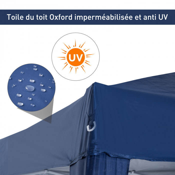 Sous cette tonnelle bleue, MyCocooning vous assure de belles soirées estivales et des fêtes de jardin tout aussi réussies ! Facile à monter, ce barnum TONAZUR se compose d'une toile imperméabilisée traitée anti-UV et de 8 piquets en acier solide. Ses belles dimensions de 3 x 2,4 mètres se replient aisément grâce au sac de transport fourni. Caractéristiques : Idéal pour organiser une petite fête, soirée, pique-nique, etc. Pliable et dépliable très facilement Toile Oxford imperméabilisée et anti UV Sac en tissu Oxford 300D x 600D pour le transport 4 pieds en acier + 8 sardines pour ancrage au sol Couleur principale : bleu Inclus : 1 sac de transport noir, 4 cordages et 8 sardines dancrage au sol, notice de montage illustrée Dimensions totales : L.3 x l.3 x H.2,4 mètres Hauteur avant-toit : 2 m Dimensions pliées : L.1,23 x l.2,0l x H.0,2 mètres Longueur cordages : 3 mètres