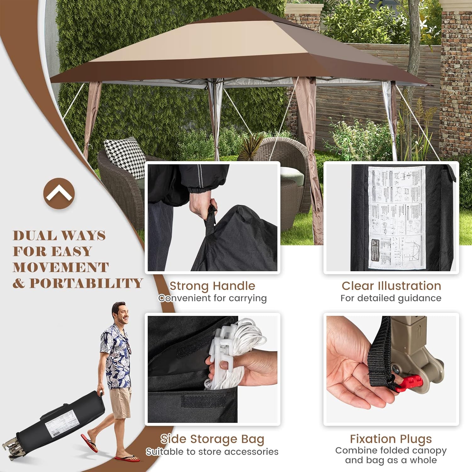 - Facile à installer: Ce mécanisme pliant vous permettra d’ouvrir le tonnelle de jardin dans quelques minutes. Quand vous ne l’utilise plus, vous pourriez le ranger dans le sac de rangement facilement. Avec des roues utiles, vous n’avez pas à le porter à main. Pousser, ça suffit.