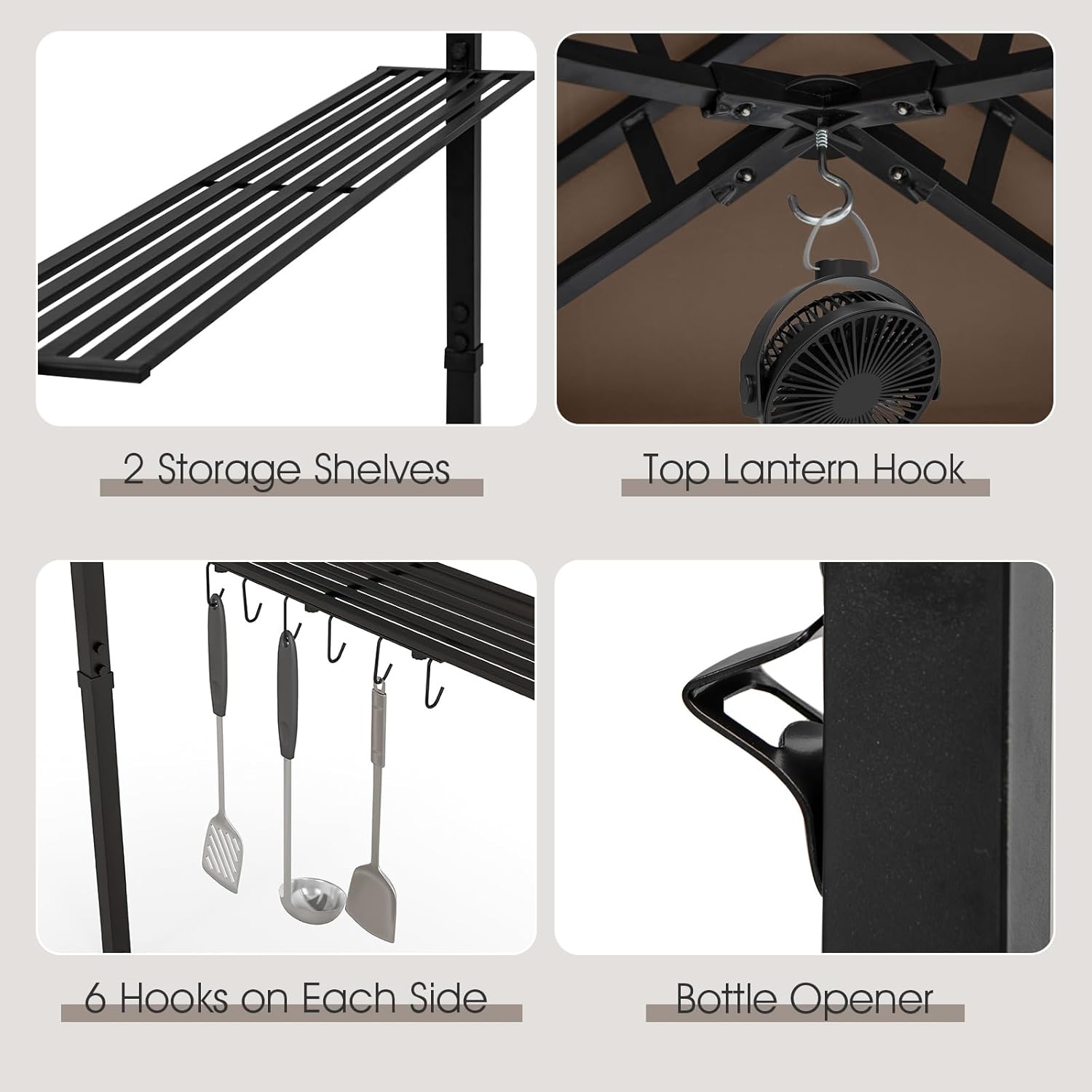 - Grand Espace et Détails Soignés : Equipé de 2 étagères latérales, de 12 crochets de suspension, l'abri pour grillades offre un grand espace de rangement pour vos boissons, assiettes et accessoires de grillades. Avec un ouvre-bouteille intégré, vous pourrez immédiatement profiter des boissons. De plus, le crochet supérieur vous permet de suspendre des lampes dans un environnement sombre.