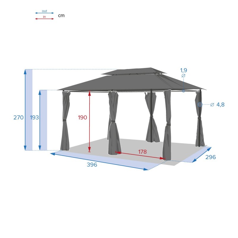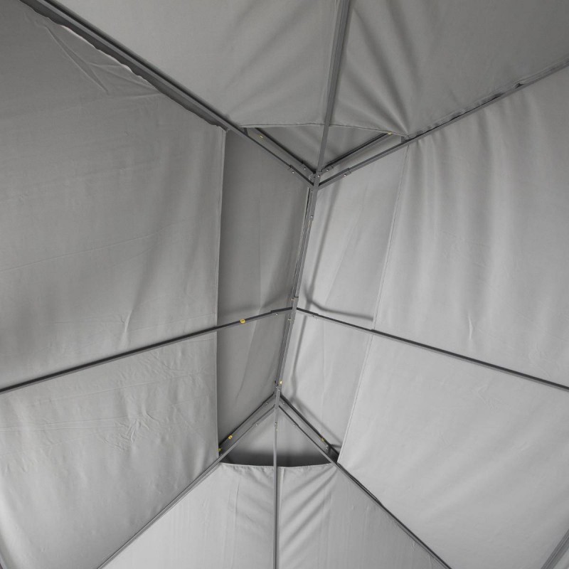 Tonnelle Thira de marque Hespéride. La qualité à petit prix. Tonnelle équipée d'une cheminée d'aération qui reste constamment ouverte gr ce à la structure ce qui réduit considérablement la prise au vent. Tonnelle livrée avec les 6 rideaux visibles sur la photo. Toile de toit déperlante pour favoriser l'élimination de petites pluies. A monter soi-même. Structure en acier traité époxy contre la rouille, toile en polyester 200 g/m ² enduit polyamide, rideaux en polyester 160 g/m². Coloris structure graphite (noir très légèrement moucheté de blanc), toile ardoise. Dimensions 3x4 m, hauteur 2.7 m. Poids 36 kg.