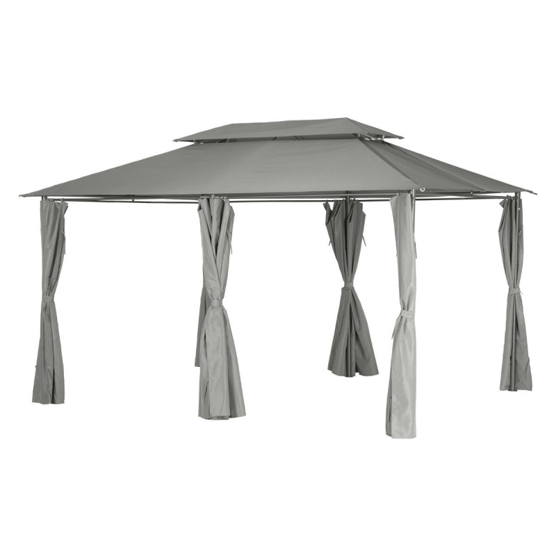 Tonnelle Thira de marque Hespéride. La qualité à  petit prix. Tonnelle équipée d'une cheminée d'aération qui reste constamment ouverte gr ce à  la structure ce qui réduit considérablement  la prise au vent. Tonnelle livrée avec les 6 rideaux visibles sur la photo. Toile de toit déperlante pour favoriser l'élimination de petites pluies. A monter soi-même. Structure en acier traité époxy contre la rouille, toile en polyester 200 g/m ² enduit polyamide, rideaux en polyester 160 g/m². Coloris structure graphite (noir très légèrement moucheté de blanc), toile ardoise. Dimensions 3x4 m, hauteur 2.7 m. Poids 36 kg.