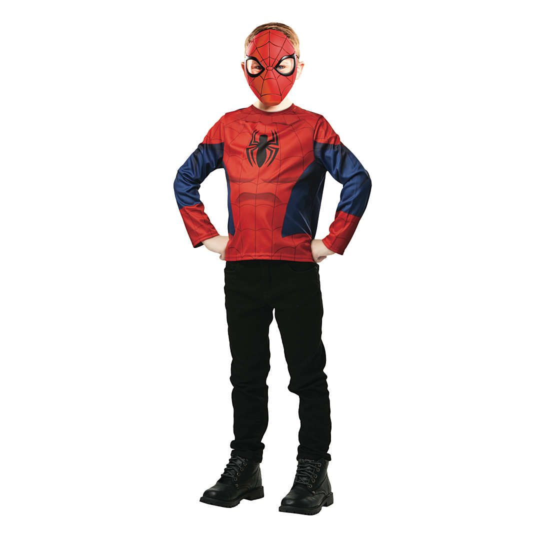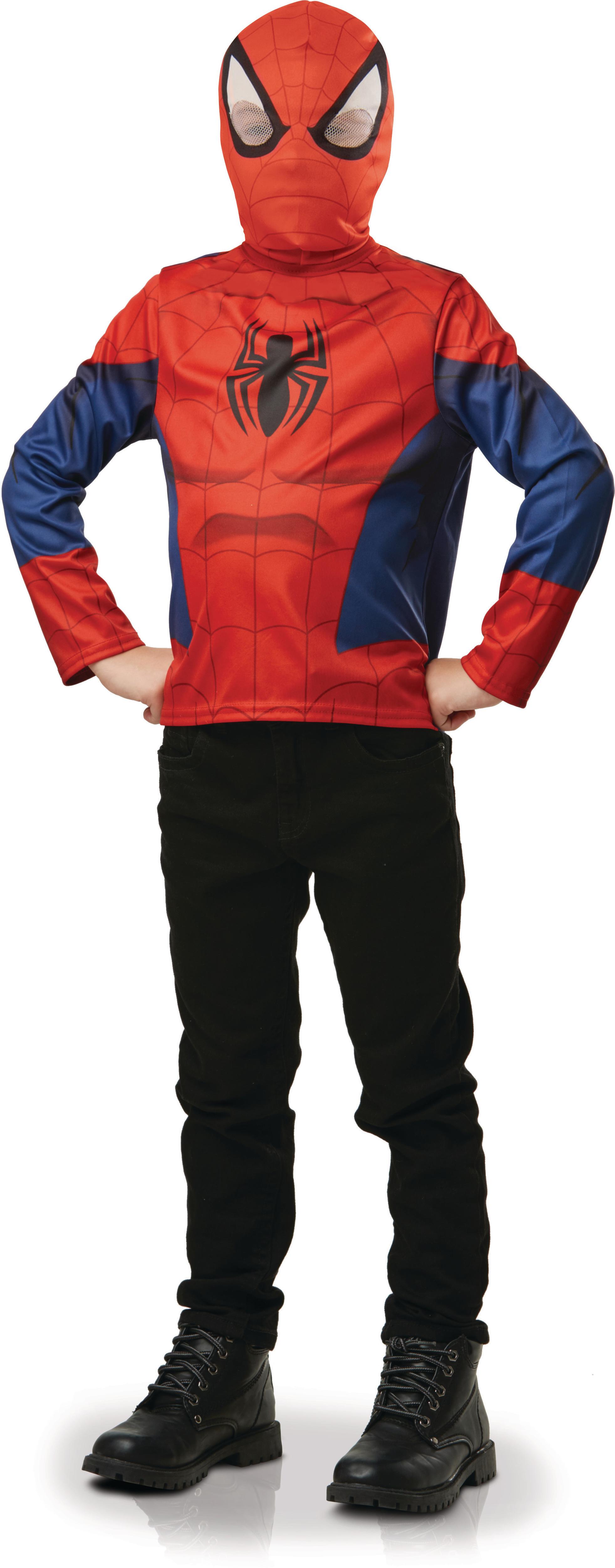 Un top en jersey rouge et bleu imprimé avec logo araignée, ceinture élastique à l’arrière et système de fermeture velcro au niveau du col.Une cagoule en tissu jersey assortie à l’effigie de Spider-Man avec attache velcro à l’arrière et ouvertures pour les yeux.