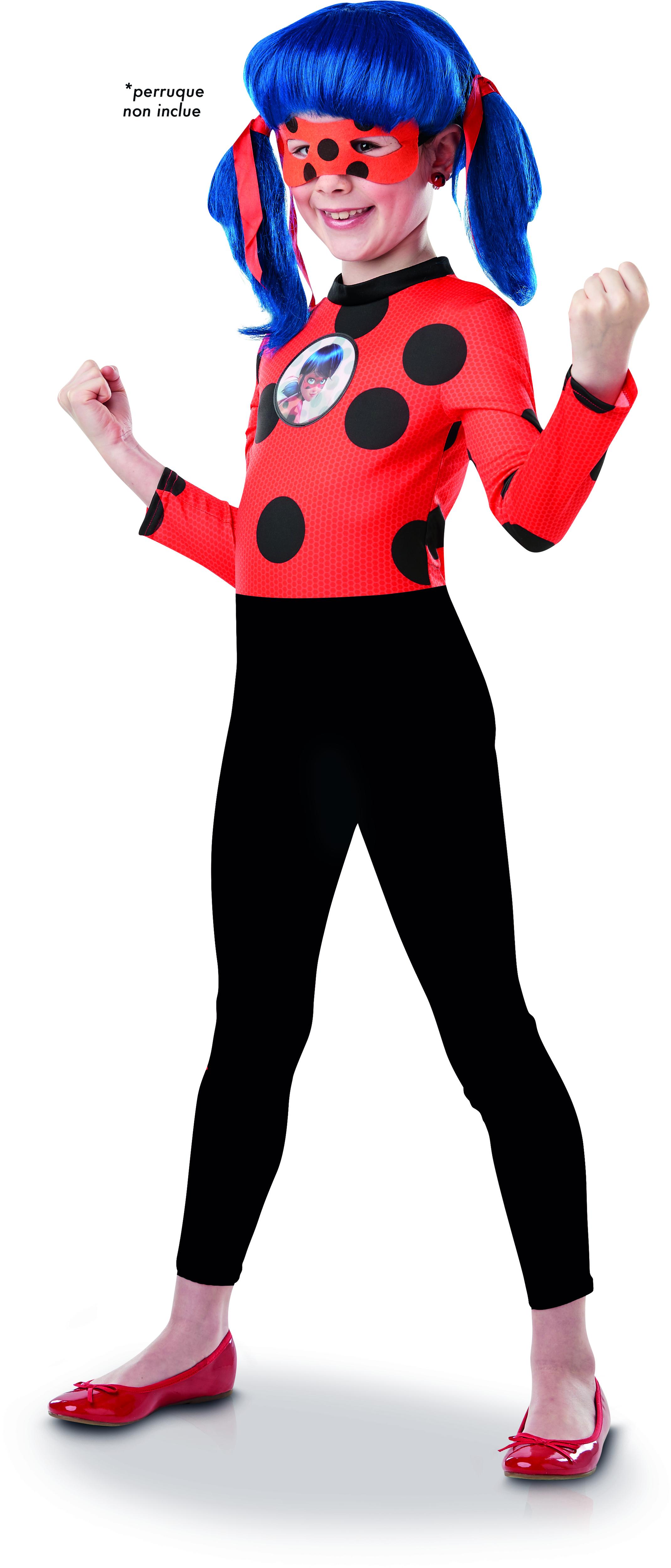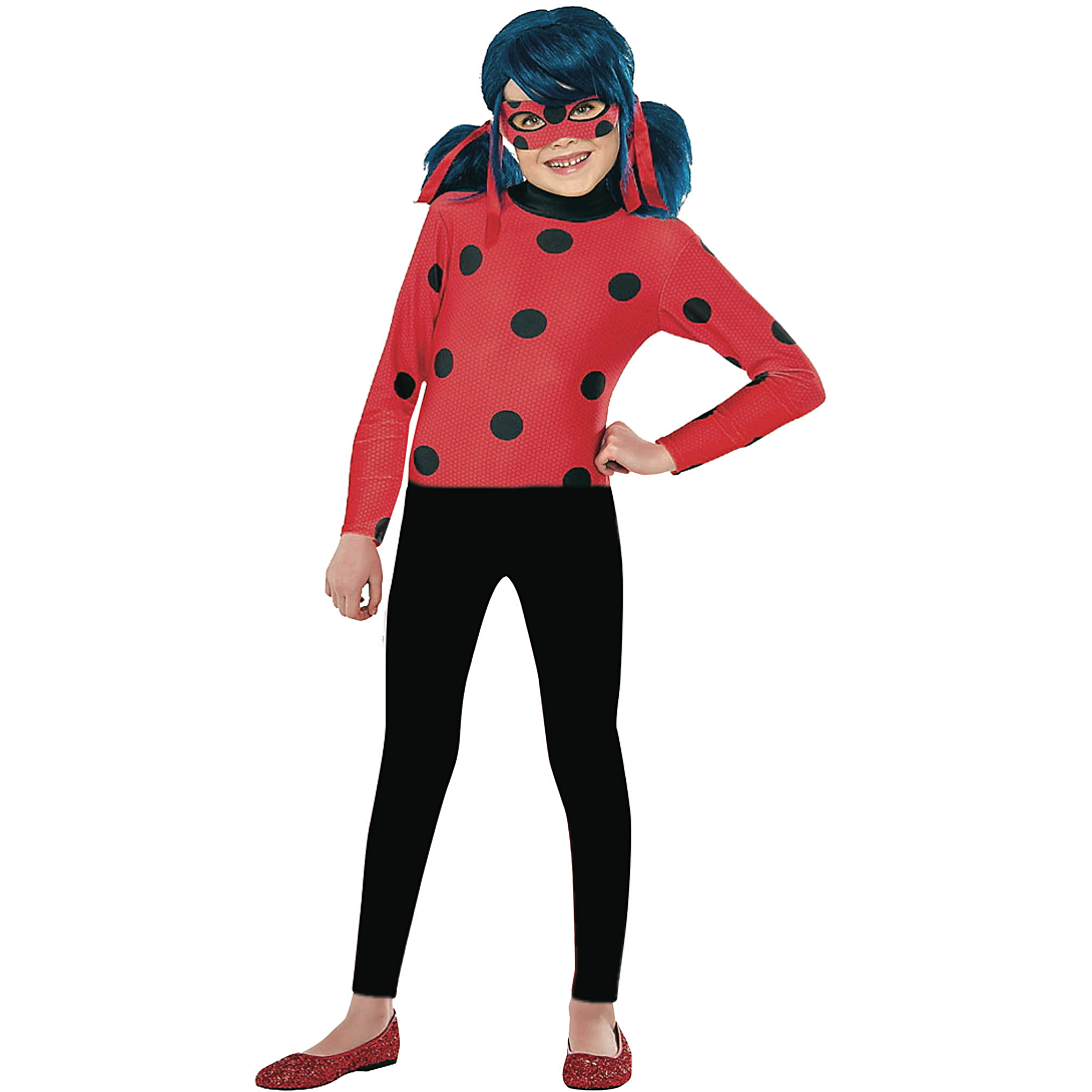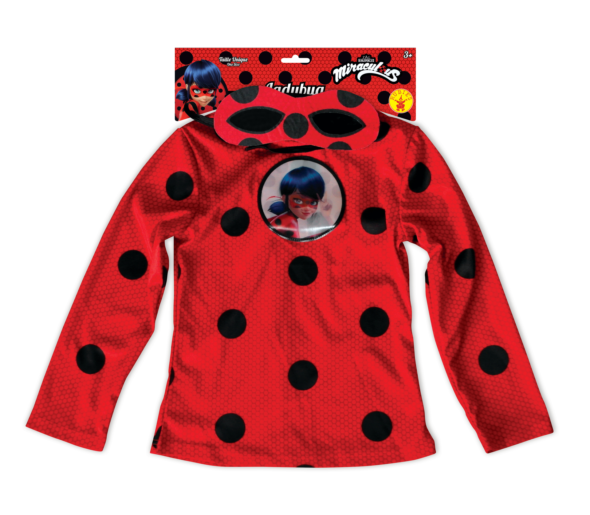 Un top à manches longues en jersey rouge à pois noirs avec portrait de Ladybug sur le buste. Un masque/loup en mousse assorti avec attache élastique à l’arrière