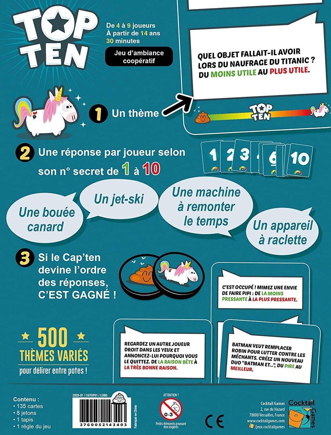 Graduez des situations loufoques de 1 à 10, en espérant que le joueur actif puisse les remettre dans le bon ordre ! Délire garanti !