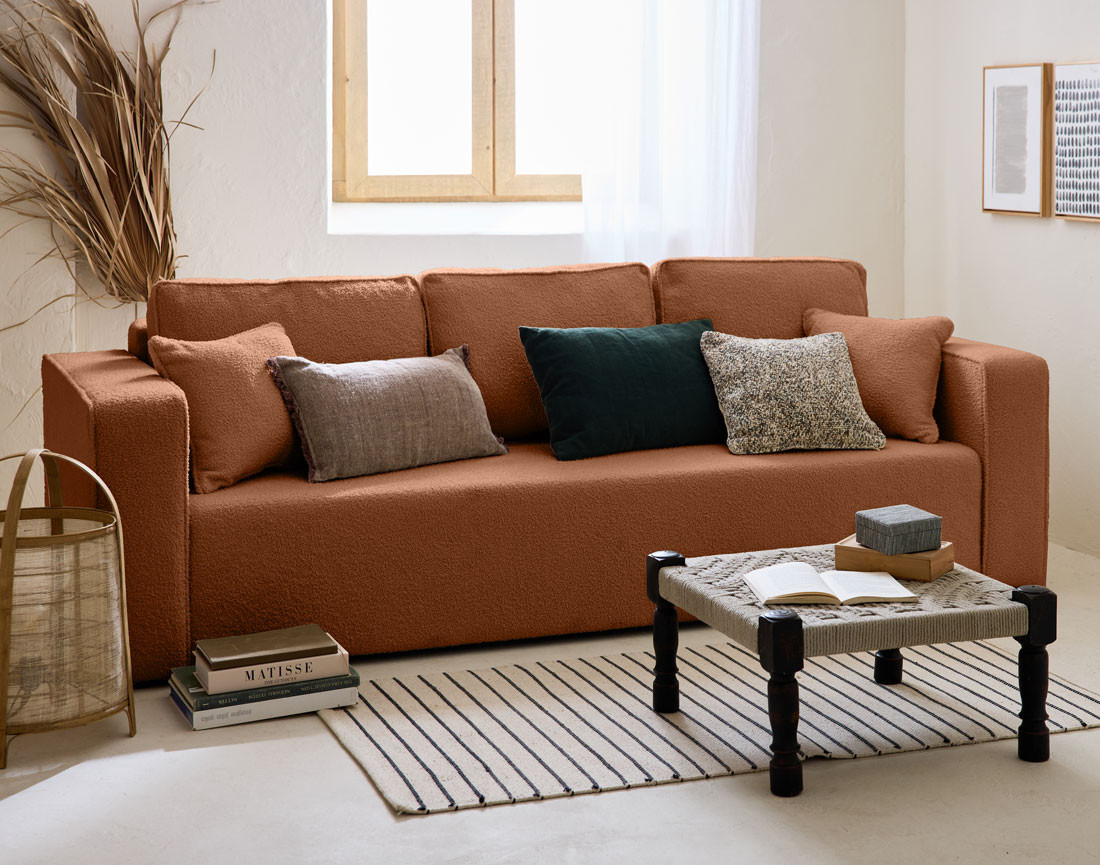 Avec son joli tissu bouclette, le canapé Topaze se hisse au sommet des tendances du moment : il apportera à votre salon un atout charme indéniable, tout en vous faisant profiter de son immense douceur. Il s’agit d’un modèle invitant à souhait, dans lequel vous adorerez vous installer pour vaquer à vos occupations de loisir préférées. Grâce à ses 3 places confortables, le canapé Topaze vous permet de profiter d’une assise généreuse mais peu encombrante, parfaite pour compléter l’ameublement de votre salon en toute harmonie. N’hésitez pas à associer votre nouveau canapé à un pouf ou un fauteuil de la même collection : osez jouer la carte du contraste en optant pour des assises complémentaires en tissu ou en velours côtelé plat. Le canapé Topaze 3 places vous est proposé en beige, terracotta, vert, taupe et en gris, pour vous permettre de l’associer astucieusement avec votre décoration intérieure.