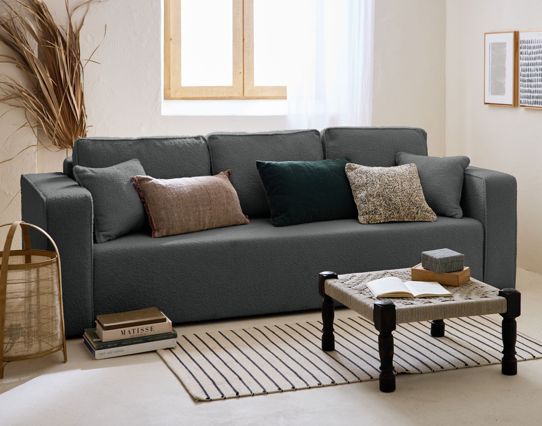 Issu d’une fabrication européenne, le canapé Topaze en tissu bouclette vous fait profiter de sa fonction convertible hyper pratique : vous n’aurez qu’à l’ouvrir en cas de besoin, pour accueillir vos invités pour la nuit ou tout simplement pour vous y allonger. Le gain de place dans votre intérieur est également assuré par un coffre de rangement astucieusement dissimulé : glissez-y vos couvertures, draps et oreillers pour transformer votre canapé en lit en quelques minutes seulement. Enfin, ce canapé est livré avec ses deux coussins décoratifs inclus, pour une décoration sophistiquée sans effort.